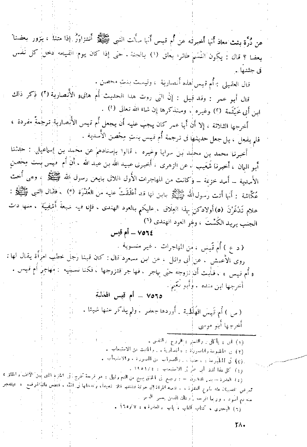أخبرنا محمد بن محمد بن سرايا وغيره، قَالُوا بِإِسْنَادِهِمْ عَنْ مُحَمَّدِ بْنِ إِسْمَاعِيلَ: حَدَّثَنَا أَبُو الْيَمَانِ، أَخْبَرَنَا شُعَيْبٌ. عَنِ الزُّهْرِيِّ، أَخْبَرَنِي عبيد الله بن عبد الله، أن أم قيس بنت محصن الأسدية- أسد خزيمة- وكانت من المهاجرات الأول اللاتي بايعن رَسُول اللَّهِ صَلَّى اللَّهُ عَلَيْهِ وَسَلَّمَ. وهي أخت عكاشة: أنها أتت رسول الله صَلَّى اللَّهُ عَلَيْهِ وَسَلَّمَ بابن لها قد أعلقت عليه من العذرة [٥] . فقال النبي صلى الله عليه وسلم: