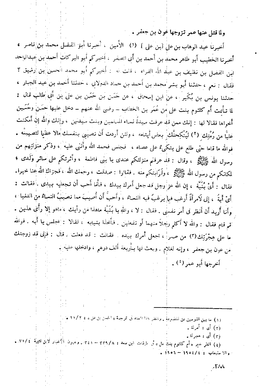 فقال: نعم، حدثنا أبو بشر محمد بن أحمد بن حماد الدولابي، حدثنا أحمد بن عبد الجبار، حدثنا يونس بن بكير، عن ابن إسحاق، عن حسن بن حسن بن علي بن أبي طالب قال: لما تأيمت أم كلثوم بنت علي من عمر بن الخطاب- رضي الله عنهم- دخل عليها حسن وحسين أخواها فقالا لها: إنك ممن قد عرفت سيدة نساء المسلمين وبنت سيدتهن، وإنك والله إن أمكنت عليا من رمتك [٢] لينكحنك بعض أيتامه، ولئن أردت أن تصيبي بنفسك مالا عظيما لتصيبنّه.