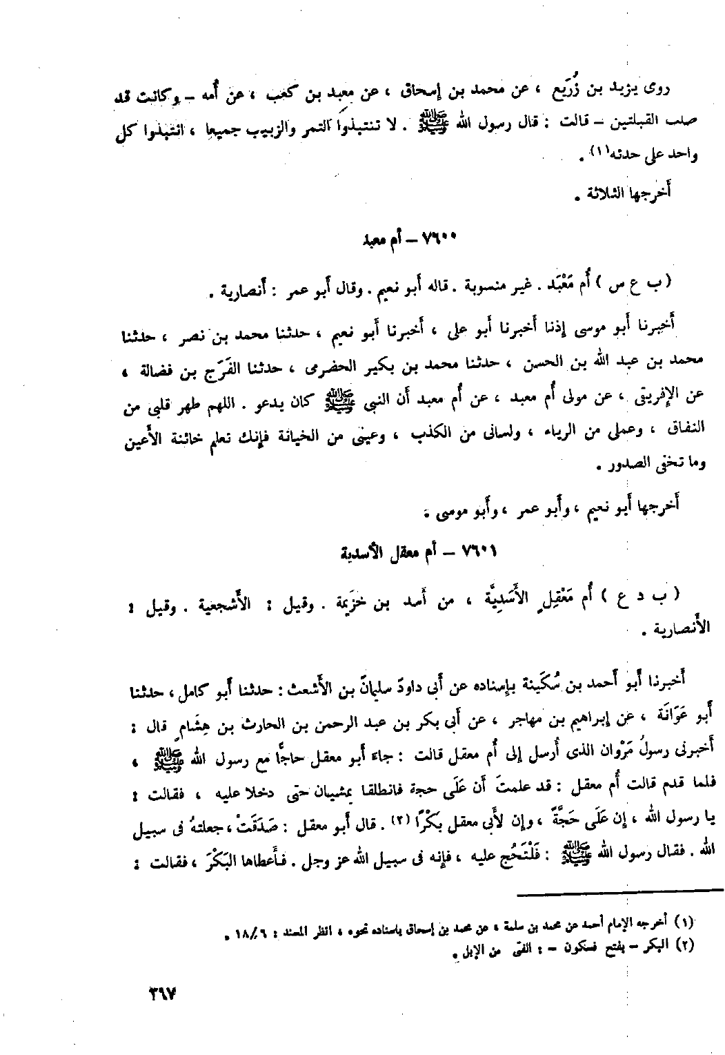 روى يزيد بن زريع، عن محمد بن إسحاق، عن معبد بن كعب، عن أمه- وكانت قد صلت القبلتين- قَالَتْ: قَالَ رَسُولُ اللَّهِ صَلَّى اللَّهُ عَلَيْهِ وسلم. لا تنتبذوا التمر والزبيب جميعاً، انتبذوا كل واحد على حدته [١] . أخرجها الثلاثة.