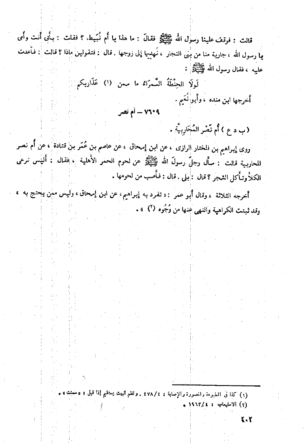 روى إبراهيم بن المختار الرازي، عَنِ ابْنِ إِسْحَاقَ، عَنْ عَاصِمِ بْنِ عُمَرَ بْن قَتَادَة، عن أم نصر المحاربية قالت: سأل رجل رَسُول اللَّهِ صَلَّى اللَّهُ عَلَيْهِ وَسَلَّمَ عن لحوم الحمر الأهلية، فقال: أليس ترعى الكلأ وتأكل الشجر؟ قال: بلى. قال: فأصب من لحومها. أخرجها الثلاثة، وقال أبو عمر: «تفرد به إبراهيم، عن ابن إسحاق، وليس ممن يحتج به، وقد ثبتت الكراهية والنهي عنها من وجوه [٢] » .