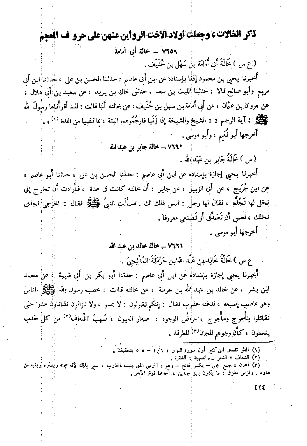 أخبرنا يحيى بن محمود إذناً بإسناده عن ابْنِ أَبِي عَاصِمٍ: حَدَّثَنَا الْحَسَنُ بْنُ عَلِيٍّ، حدثنا ابن أبي مريم وأبو صالح قالا: حدثنا الليث بن سعد، حدثني خَالِدِ بْنِ يَزِيدَ، عَنْ سَعِيدِ بْنِ أَبِي هلال، عن مروان بن عثمان، عَنْ أَبِي أُمَامَةَ بْن سَهْلِ بْن حُنَيْفٍ، عن خالته أنها قالت: لقد أقرأناها رسول الله صلى الله عليه وسلم: آية الرجم: «الشيخ والشيخة إذا زنيا فارجموهما ألبتة، بما قضيا من اللذة [١] » .