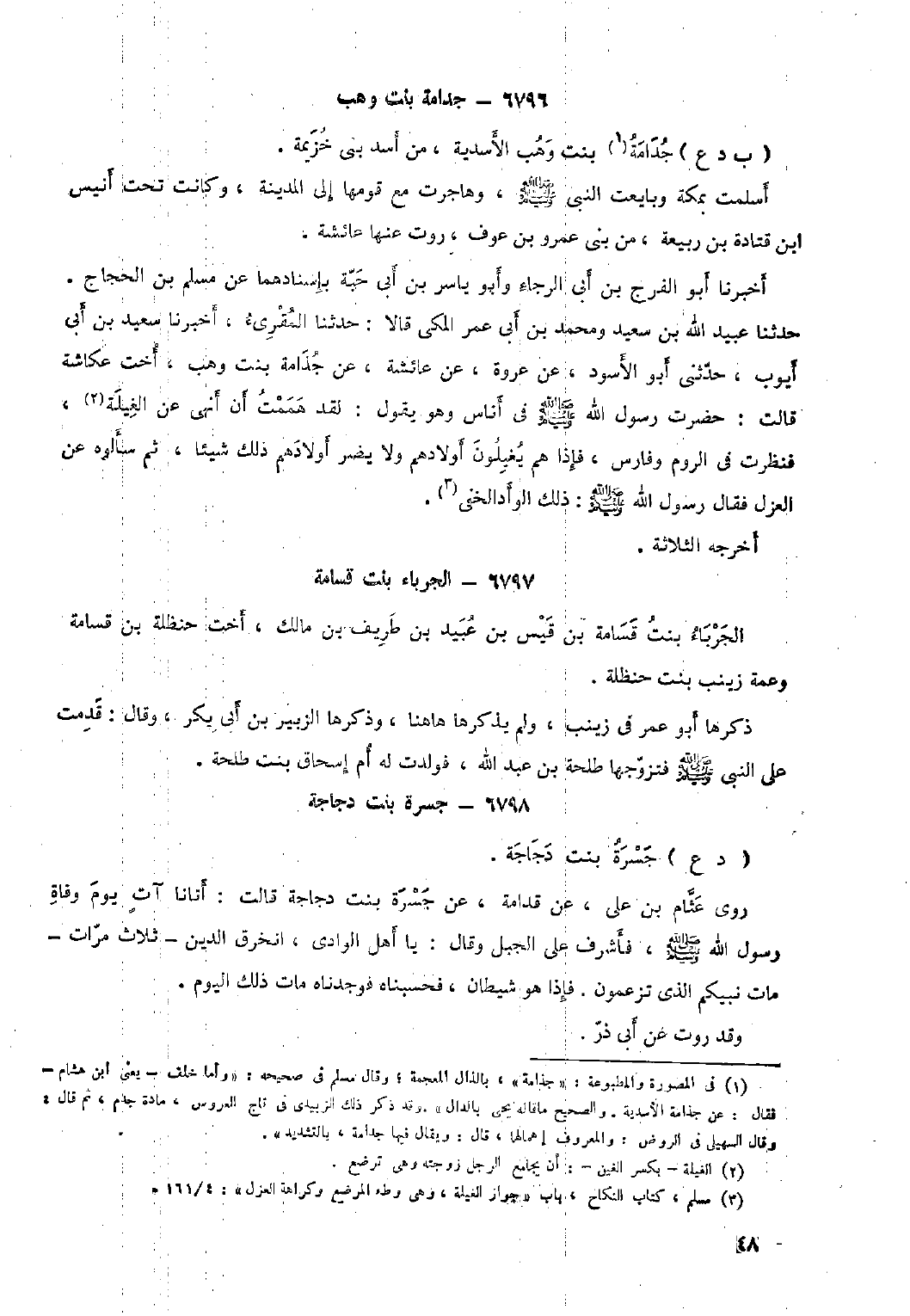 [١] في المصورة والمطبوعة: «جذامة» ، بالذال المعجمة وقال مسلم في صحيحه: «وأما خلف- يعنى ابن هشام- فقال: عن جذامة الأسدية. والصحيح ما قاله يحى بالدال» . وقد ذكر ذلك الزبيدي في تاج العروس، مادة جدم، ثم قال: