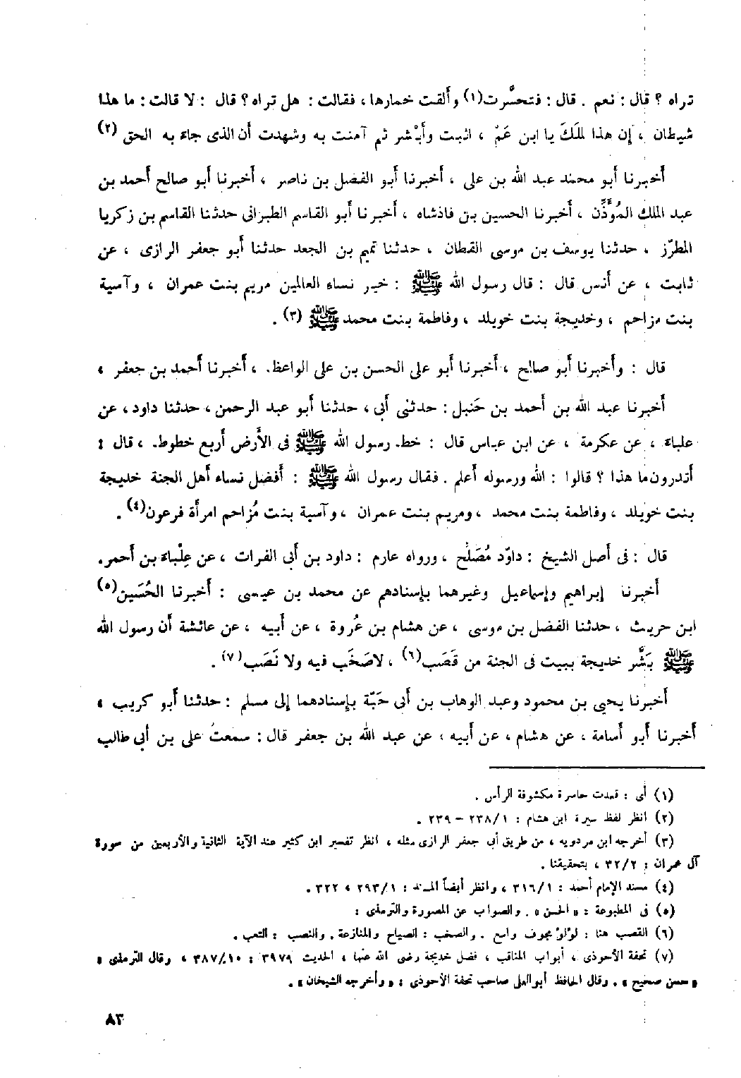 تراه؟ قال: نعم. قال: فتحسرت [١] وألقت خمارها، فقالت: هل تراه؟ قال: لا قالت: ما هذا شيطان، إن هذا لملك يا ابن عم، اثبت وأبشر ثم آمنت به وشهدت أن الذي جاء به الحق [٢] أَخْبَرَنَا أَبُو مُحَمَّدٍ عَبْدُ اللَّهِ بْنُ عَلِيِّ، أَخْبَرَنَا أَبُو الْفَضْلِ بْنُ نَاصِرٍ، أَخْبَرَنَا أَبُو صالح أحمد بن عبد الملك المؤذن، أخبرنا الحسين بن فاذشاه، أخبرنا أبو القاسم الطبراني حدثنا القاسم بن زكريا المطرز، حدثنا يوسف بن موسى القطان، حدثنا تميم بن الجعد حدثنا أبو جعفر الرازي، عَنْ ثَابِتٌ، عَنْ أَنَسٍ قَالَ: قَالَ رَسُولُ اللَّهِ صلى الله عليه وسلم: خير نساء العالمين مريم بنت عمران، وآسية بنت مزاحم، وخديجة بنت خويلد، وفاطمة بنت محمد صلى الله عليه وسلم [٣] . قال: وأخبرنا أبو صالح، أخبرنا أبو علي الحسن بن علي الواعظ، أخبرنا أحمد بن جعفر، أَخْبَرَنَا عَبْدُ اللَّهِ بْنُ أَحْمَدَ بْنِ حَنْبَلٍ: حدثني أبي، حدثنا أبو عبد الرحمن، حدثنا داود، عن علباء، عن عكرمة، عن ابن عباس قال: خط رسول الله صلى الله عليه وسلم في الأرض أربع خطوط، قال: