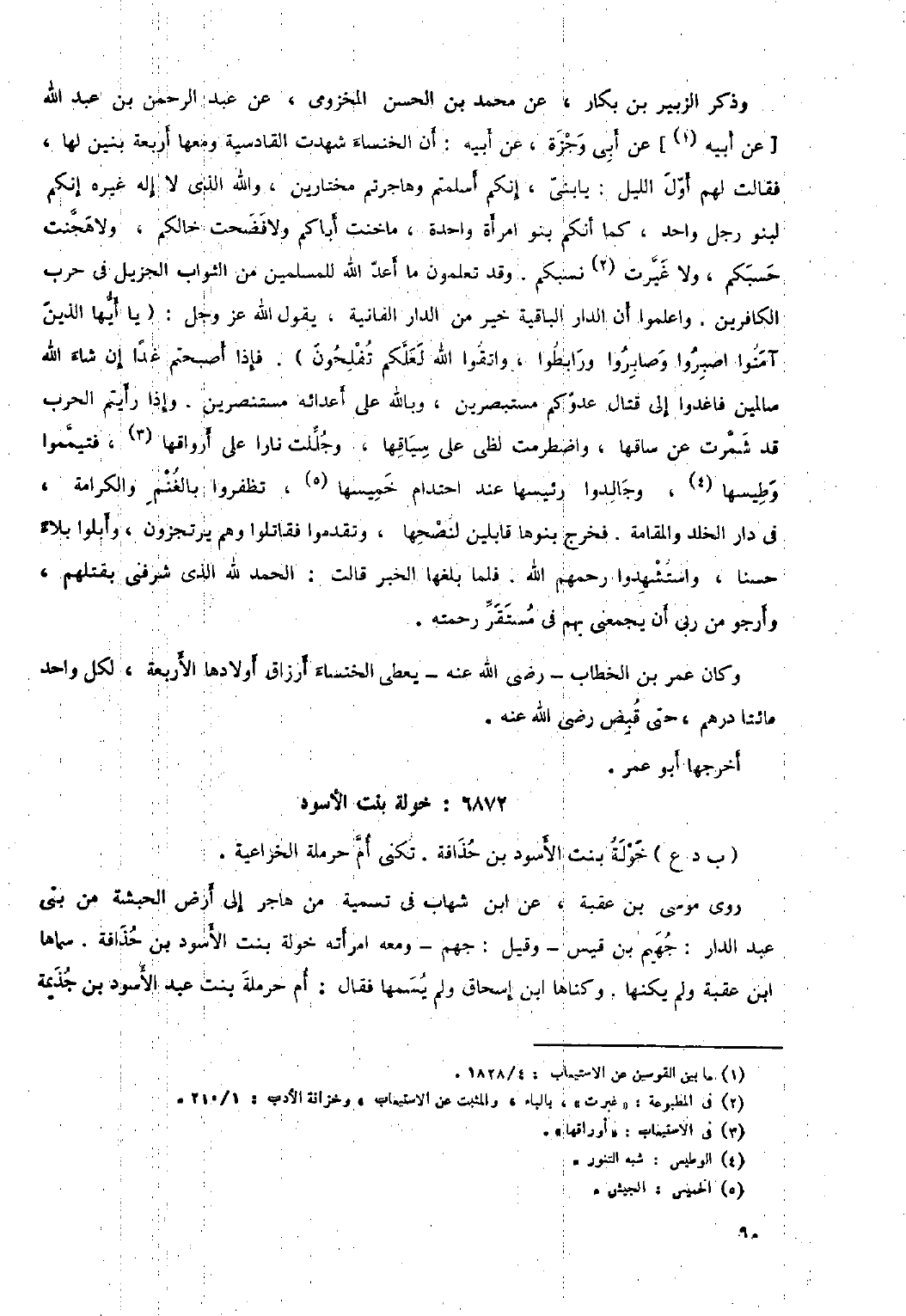 وذكر الزبير بن بكار، عن محمد بن الحسن المخزومي، عَنْ عَبْدِ الرَّحْمَنِ بْنِ عَبْدِ اللَّهِ [عَنِ أبيه [١]] عن أبي وجزة، عن أبيه: أن الخنساء شهدت القادسية ومعها أربعة بنين لها، فقالت لهم أول الليل: يا بني، إنكم أسلمتم وهاجرتم مختارين، والله الذي لا إله غيره إنكم لبنو رجل واحد، كما أنكم بنو امرأة واحدة، ما خنت أباكم ولا فضحت خالكم، ولا هجنت حسبكم، ولا غيرت [٢] نسبكم. وقد تعلمون ما أعد الله للمسلمين من الثواب الجزيل في حرب الكافرين. واعلموا أن الدار الباقية خير من الدار الفانية، يقول الله عز وجل: (يا أَيُّهَا الَّذِينَ آمَنُوا اصْبِرُوا وَصابِرُوا وَرابِطُوا، وَاتَّقُوا اللَّهَ لَعَلَّكُمْ تُفْلِحُونَ ٣: ٢٠٠) . فإذا أصبحتم غدا إن شاء الله سالمين فاغدوا إلى قتال عدوكم مستبصرين، وباللَّه على أعدائه مستنصرين. وإذا رأيتم الحرب قد شمرت عن ساقها، واضطرمت لظى على سياقها، وجللت نارا على أرواقها [٣] ، فتيمموا وطيسها [٤] ، وجالدوا رئيسها عند احتدام خميسها [٥] ، تظفروا بالغنم والكرامة، في دار الخلد والمقامة. فخرج بنوها قابلين لنصحها، وتقدموا فقاتلوا وهم يرتجزون، وأبلوا بلاء حسنا، واستشهدوا رحمهم الله. فلما بلغها الخبر قالت: الحمد للَّه الذي شرفني بقتلهم، وأرجو من ربي أن يجمعني بهم في مستقر رحمته.