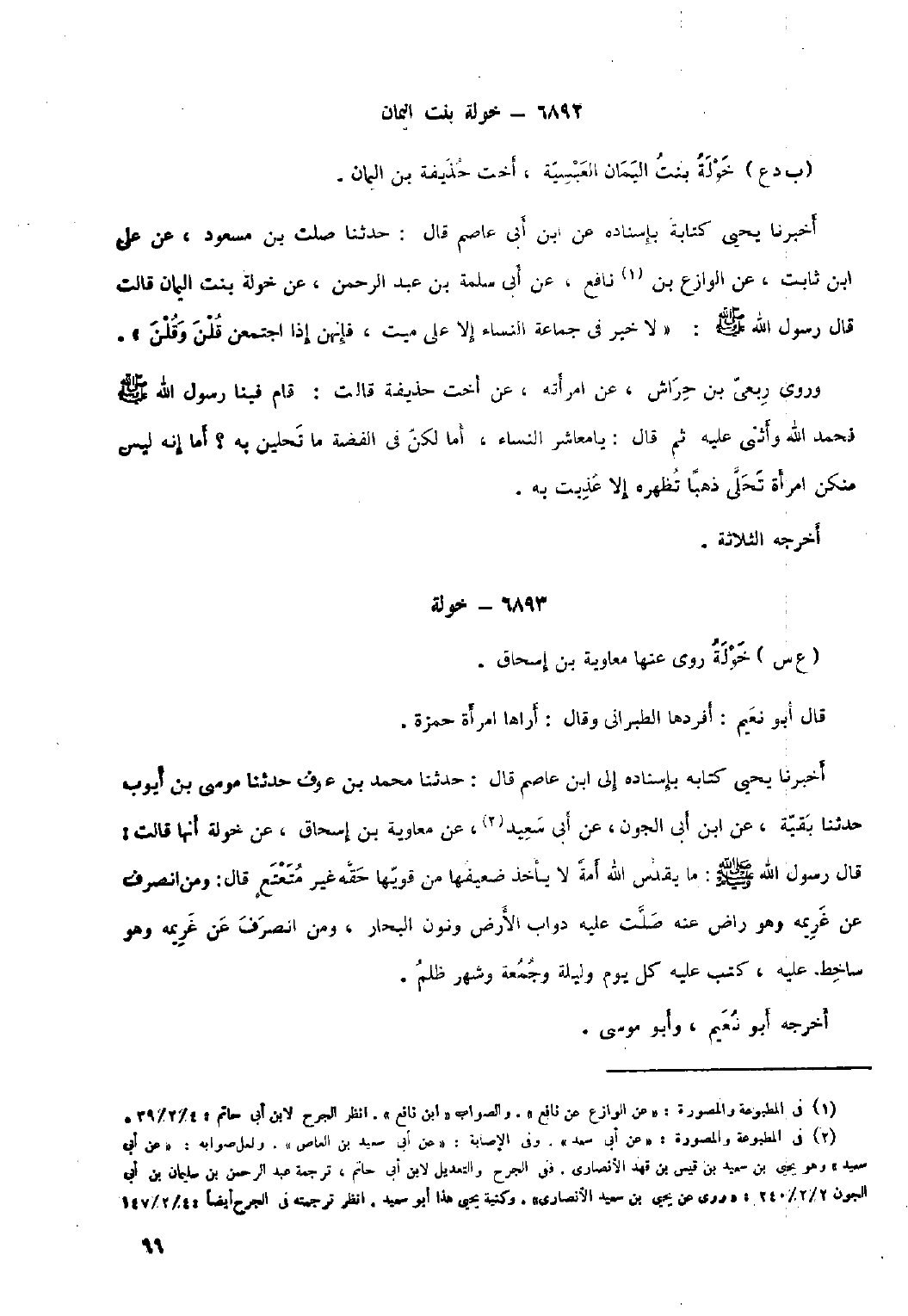 أخبرنا يحيى كتابة بِإِسْنَادِهِ عَنِ ابْنِ أَبِي عَاصِمٍ قَالَ: حَدَّثَنَا صلت بن مسعود، عن علي ابن ثابت، عن الوازع بن [١] نافع، عن أبي سلمة بن عبد الرحمن، عن خولة بنت اليمان قَالَتْ قَالَ رَسُولُ اللَّهِ صَلَّى اللَّهُ عَلَيْهِ وسلم: «لا خير في جماعة النساء إلا على ميت، فإنهن إذا اجتمعن قلن وقلن» . وروى ربعي بن حراش، عن امرأته، عن أخت حذيفة قالت: قام فِينَا رَسُولُ اللَّهِ صَلَّى اللَّهُ عَلَيْهِ وَسَلَّمَ فَحَمِدَ الله وأثنى عليه ثم قال: يا معاشر النساء، أما لكن في الفضة ما تحلين به؟ أما إنه ليس منكن امرأة تحلى ذهبا تظهره إلا عذبت به. أخرجه الثلاثة.