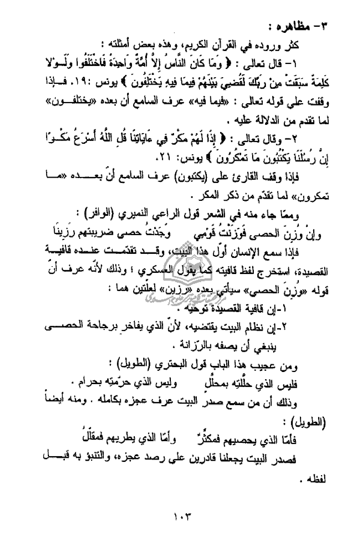 1 - قال تعالى: وَما كانَ النَّاسُ إِلَّا أُمَّةً واحِدَةً فَاخْتَلَفُوا وَلَوْلا كَلِمَةٌ سَبَقَتْ مِنْ رَبِّكَ لَقُضِيَ بَيْنَهُمْ فِيما فِيهِ يَخْتَلِفُونَ يونس: 19. فإذا وقفت على قوله تعالى: «فِيما فِيهِ» عرف السامع أن بعده «يختلفون» لما تقدم من الدلالة عليه.