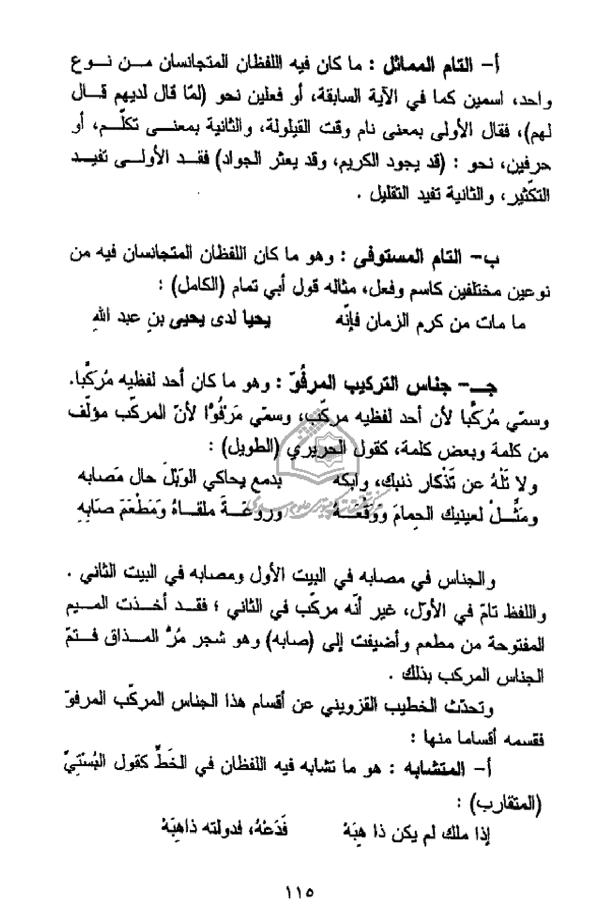 واللفظ تامّ في الأوّل، غير أنّه مركّب في الثاني؛ فقد أخذت الميم المفتوحة من مطعم وأضيفت إلى (صابه) وهو شجر مرّ المذاق فتمّ الجناس المركب بذلك.
