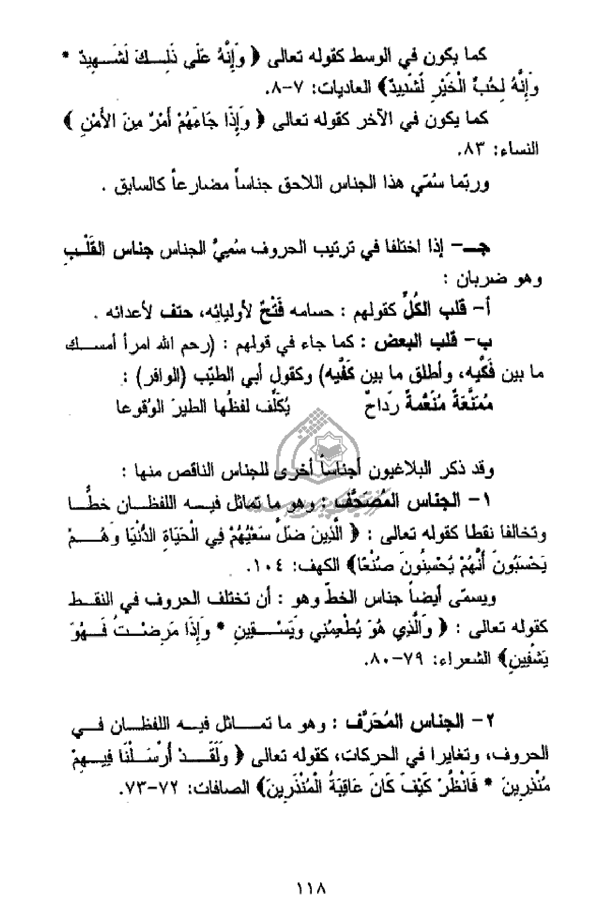 1 - الجناس المصحّف: وهو ما تماثل فيه اللفظان خطّا وتخالفا نقطا كقوله تعالى: الَّذِينَ ضَلَّ سَعْيُهُمْ فِي الْحَياةِ الدُّنْيا وَهُمْ يَحْسَبُونَ أَنَّهُمْ يُحْسِنُونَ صُنْعاً الكهف: 104.