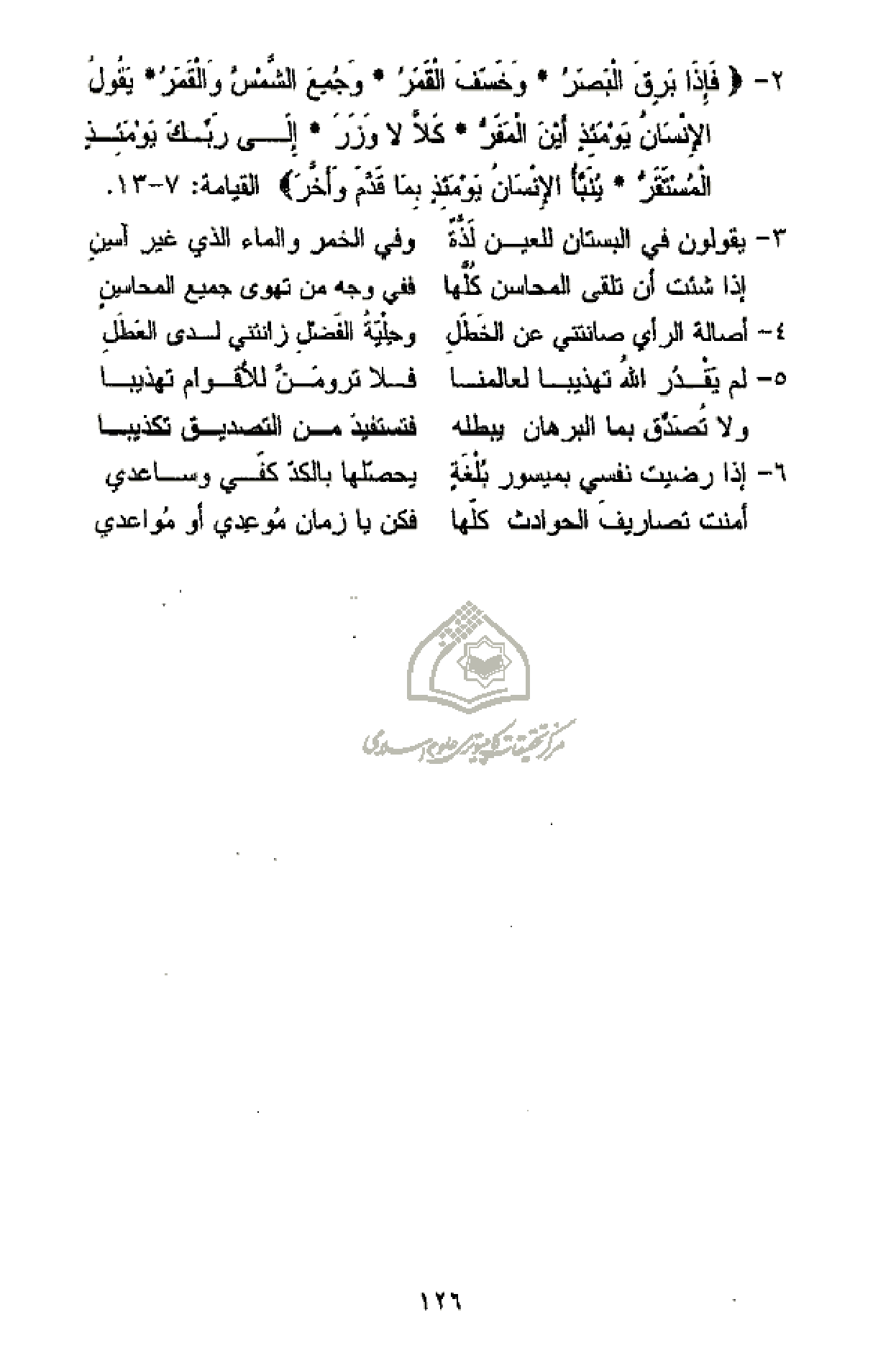 2 - فَإِذا بَرِقَ الْبَصَرُ* وَخَسَفَ الْقَمَرُ* وَجُمِعَ الشَّمْسُ وَالْقَمَرُ* يَقُولُ الْإِنْسانُ يَوْمَئِذٍ أَيْنَ الْمَفَرُّ* كَلَّا لا وَزَرَ* إِلى رَبِّكَ يَوْمَئِذٍ الْمُسْتَقَرُّ* يُنَبَّؤُا الْإِنْسانُ يَوْمَئِذٍ بِما قَدَّمَ وَأَخَّرَ القيامة: 7 - 13.