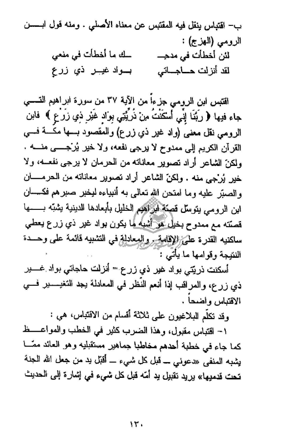 1 - اقتباس مقبول، وهذا الضرب كثير في الخطب والمواعظ كما جاء في خطبة أحدهم مخاطبا جماهير مستقبليه وهو العائد ممّا يشبه المنفى «دعوني- قبل كل شيء- أقبّل يد من جعل الله الجنة تحت قدميها» يريد تقبيل يد أمّه قبل كل شيء في إشارة إلى الحديث