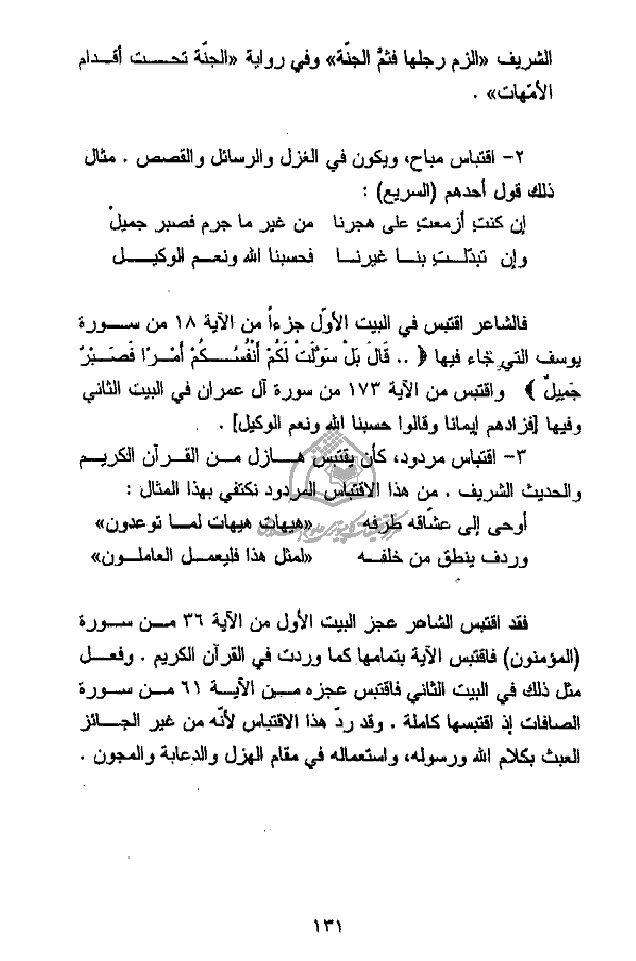 2 - اقتباس مباح، ويكون في الغزل والرسائل والقصص. مثال ذلك قول أحدهم (السريع):