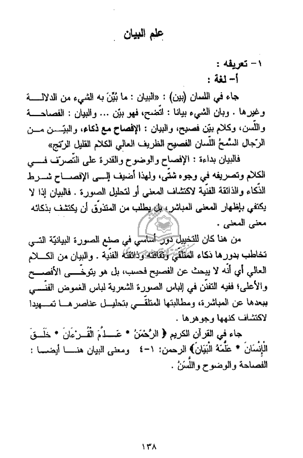 جاء في القرآن الكريم الرَّحْمنُ* عَلَّمَ الْقُرْآنَ* خَلَقَ الْإِنْسانَ* عَلَّمَهُ الْبَيانَ الرحمن: 1 - 4 ومعنى البيان هنا أيضا: