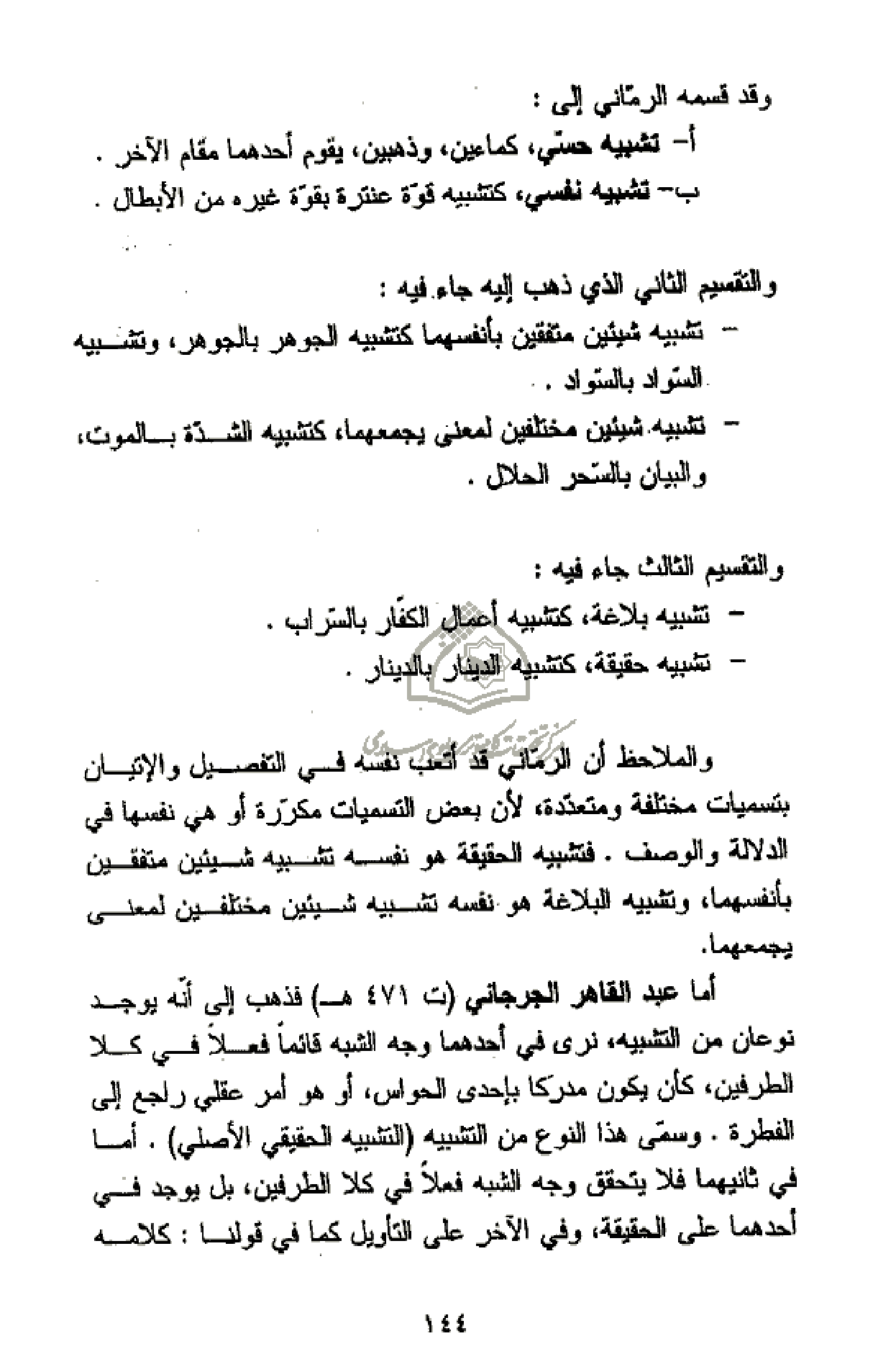 والملاحظ أن الرمّاني قد أتعب نفسه في التفصيل والإتيان بتسميات مختلفة ومتعدّدة، لأن بعض التسميات مكرّرة أو هي نفسها في الدلالة والوصف. فتشبيه الحقيقة هو نفسه تشبيه شيئين متفقين بأنفسهما، وتشبيه البلاغة هو نفسه تشبيه شيئين مختلفين لمعنى يجمعهما.