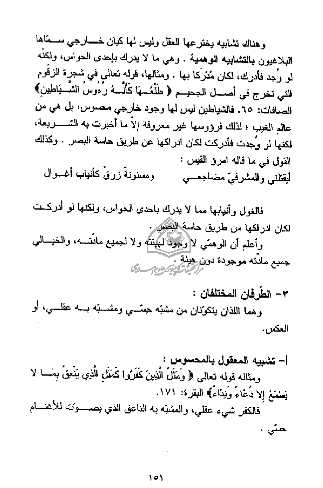 وهناك تشابيه يخترعها العقل وليس لها كيان خارجي سمّاها البلاغيون بالتشابيه الوهمية. وهي ما لا يدرك بإحدى الحواس، ولكنّه لو وجد فأدرك، لكان مدركا بها. ومثالها، قوله تعالى في شجرة الزقّوم التي تخرج في أصل الجحيم طَلْعُها كَأَنَّهُ رُؤُسُ الشَّياطِينِ الصافات: 65. فالشياطين ليس لها وجود خارجي محسوس، بل هي من عالم الغيب؛ لذلك فرؤوسها غير معروفة إلّا ما أخبرت به الشريعة، لكنها لو وجدت فأدركت لكان ادراكها عن طريق حاسة البصر. وكذلك القول في ما قاله امرؤ القيس: