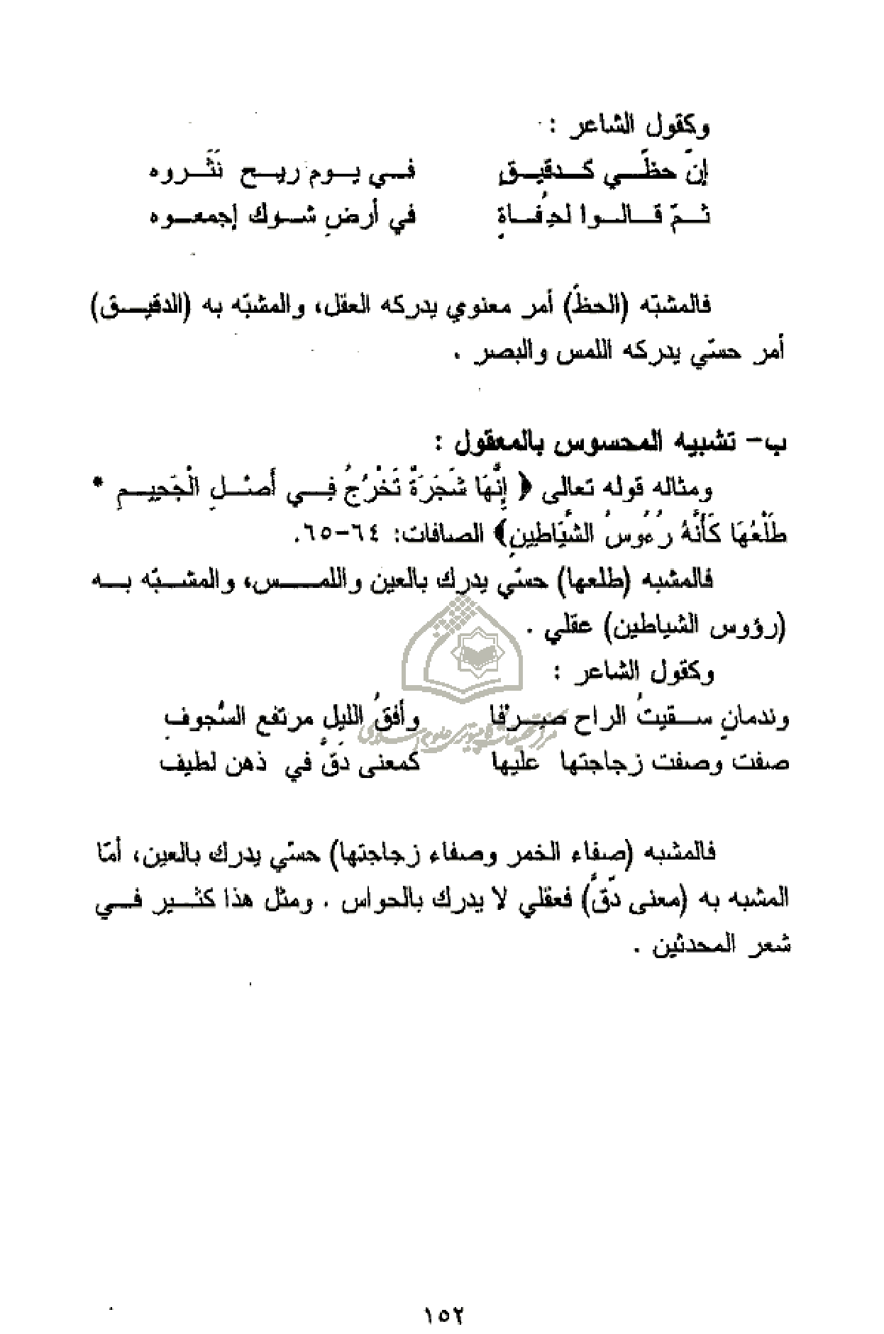فالمشبه (صفاء الخمر وصفاء زجاجتها) حسّي يدرك بالعين، أمّا المشبه به (معنى دقّ) فعقلي لا يدرك بالحواس. ومثل هذا كثير في شعر المحدثين.