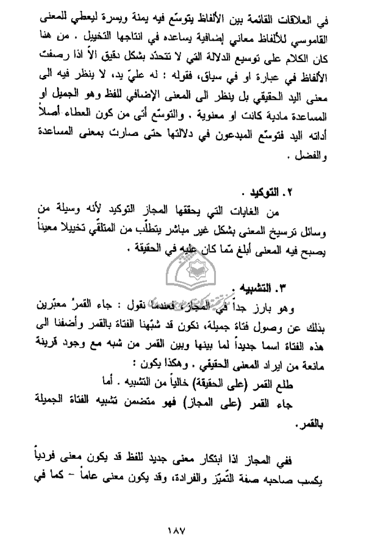 من الغايات التي يحققها المجاز التوكيد لأنه وسيلة من وسائل ترسيخ المعنى بشكل غير مباشر يتطلّب من المتلقّي تخييلا معينا يصبح فيه المعنى أبلغ مّما كان عليه في الحقيقة.