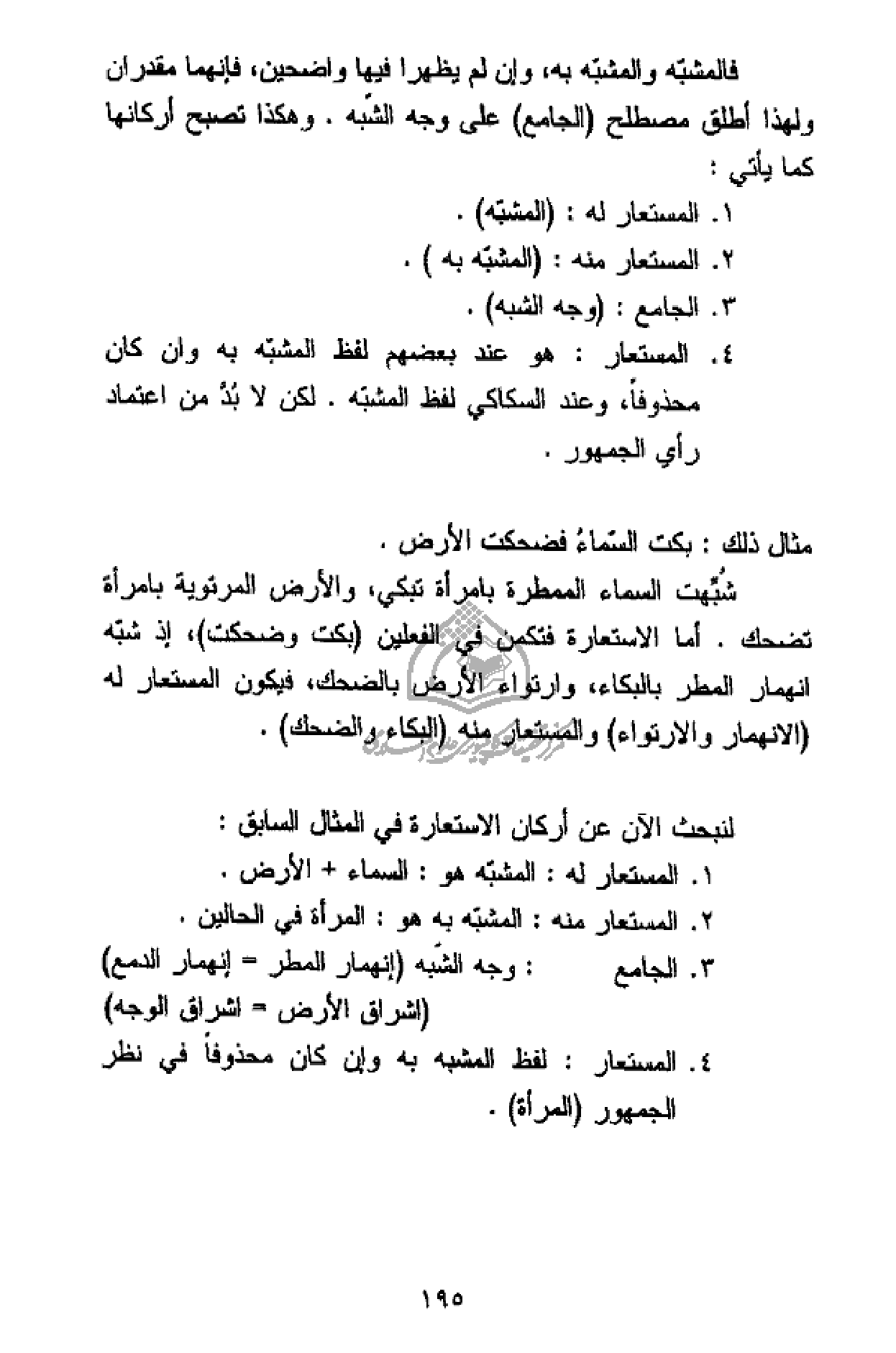 4. المستعار: هو عند بعضهم لفظ المشبّه به وان كان محذوفا، وعند السكاكي لفظ المشبّه. لكن لا بدّ من اعتماد رأي الجمهور.