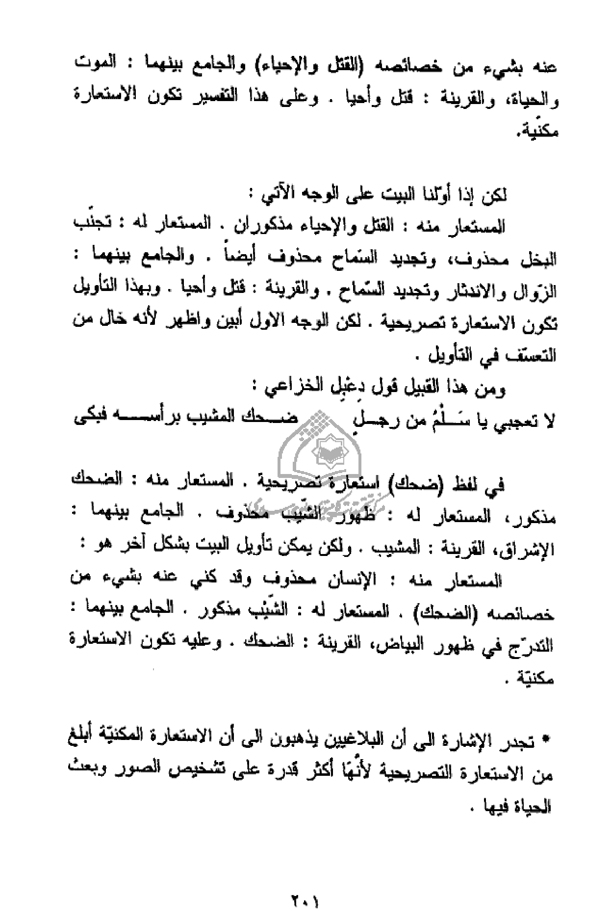 الزّوال والاندثار وتجديد السّماح. والقرينة: قتل وأحيا. وبهذا التأويل تكون الاستعارة تصريحية. لكن الوجه الاول أبين واظهر لأنه خال من التعسّف في التأويل.