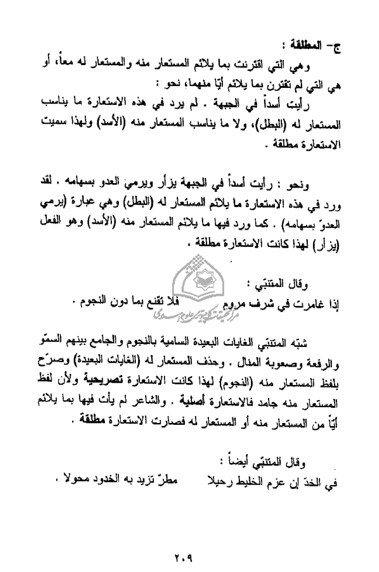 ونحو: رأيت أسدا في الجبهة يزأر ويرمي العدو بسهامه. لقد ورد في هذه الاستعارة ما يلائم المستعار له (البطل) وهي عبارة (يرمي العدوّ بسهامه). كما ورد فيها ما يلائم المستعار منه (الأسد) وهو الفعل (يزأر) لهذا كانت الاستعارة مطلقة.