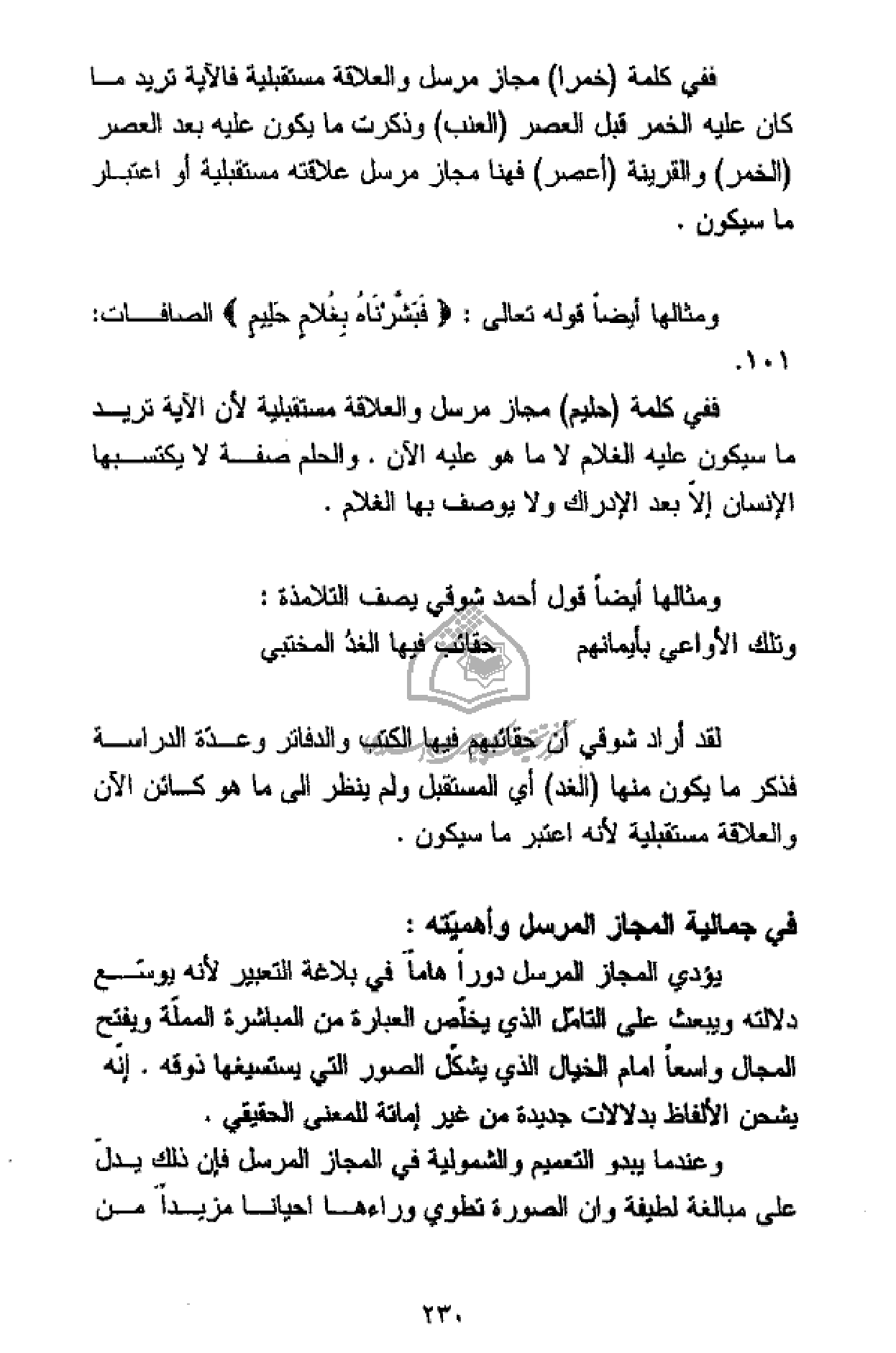 ففي كلمة (حليم) مجاز مرسل والعلاقة مستقبلية لأن الآية تريد ما سيكون عليه الغلام لا ما هو عليه الآن. والحلم صفة لا يكتسبها الإنسان إلّا بعد الإدراك ولا يوصف بها الغلام.