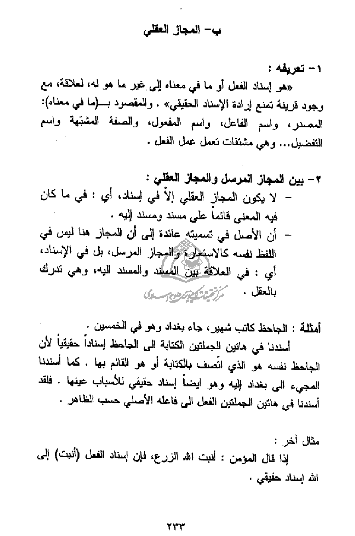 «هو إسناد الفعل أو ما في معناه إلى غير ما هو له، لعلاقة، مع وجود قرينة تمنع إرادة الإسناد الحقيقي». والمقصود ب (ما في معناه):