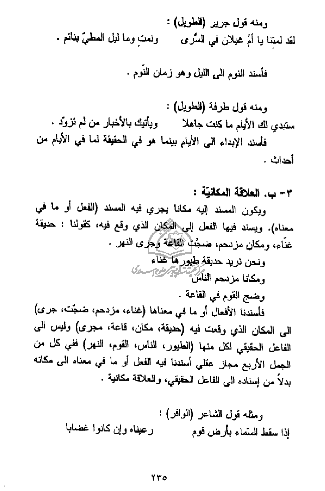 فأسندنا الأفعال أو ما في معناها (غناء، مزدحم، ضجّت، جرى) الى المكان الذي وقعت فيه (حديقة، مكان، قاعة، مجرى) وليس الى الفاعل الحقيقي لكل منها (الطيور، الناس، القوم، النهر) ففي كل من الجمل الأربع مجاز عقلي أسندنا فيه الفعل أو ما في معناه الى مكانه بدلا من إسناده الى الفاعل الحقيقي، والعلاقة مكانية.