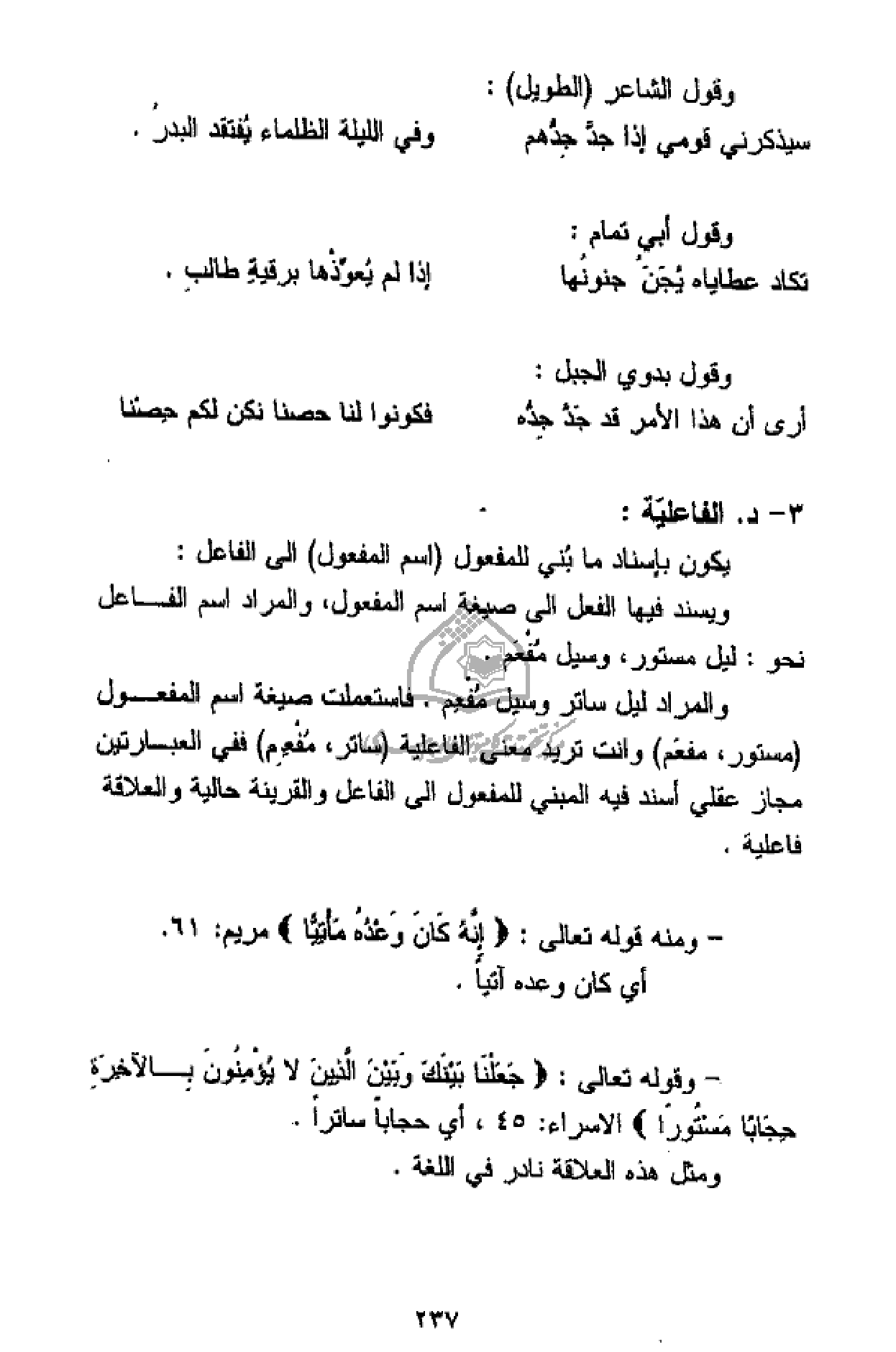 ويسند فيها الفعل الى صيغة اسم المفعول، والمراد اسم الفاعل نحو: ليل مستور، وسيل مفعم.