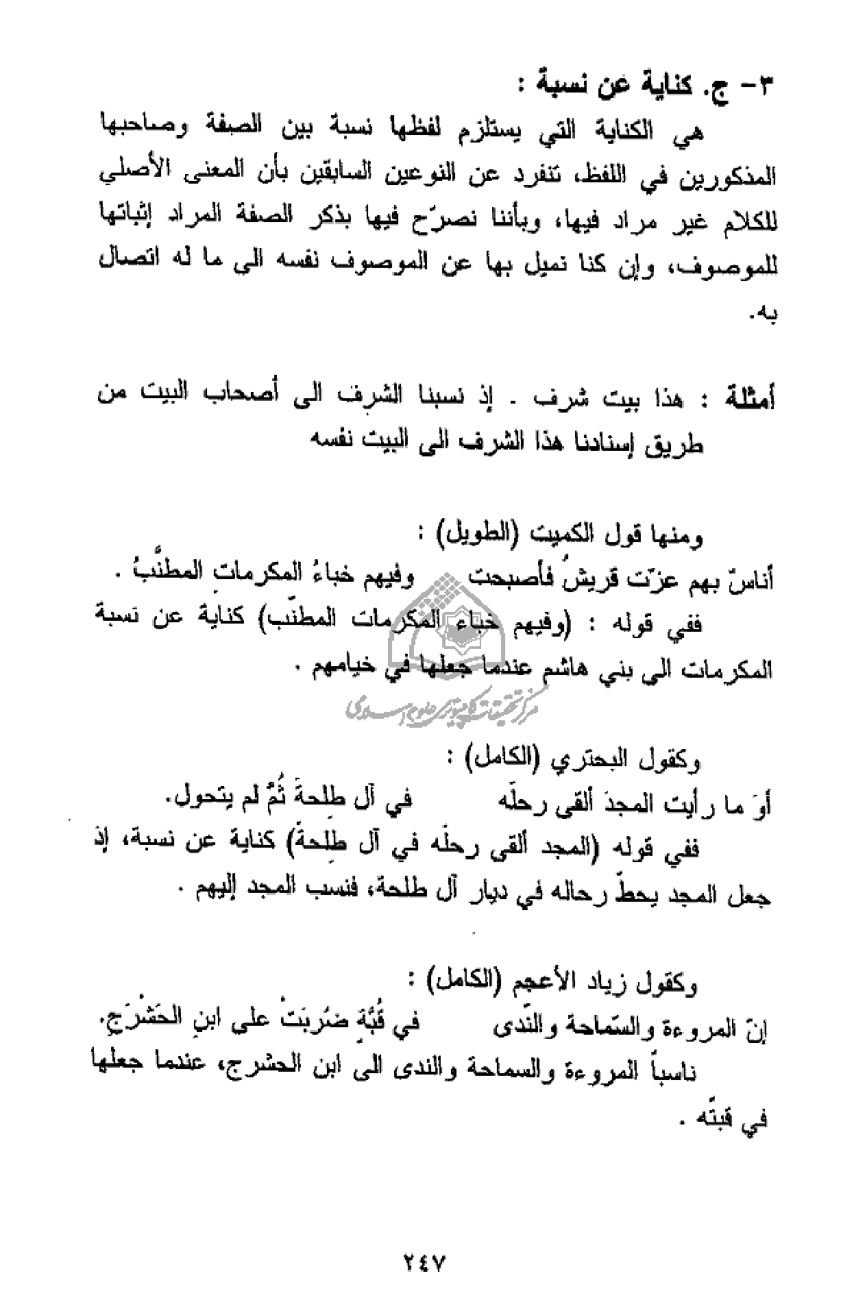 ففي قوله (المجد ألقى رحله في آل طلحة) كناية عن نسبة، إذ جعل المجد يحطّ رحاله في ديار آل طلحة، فنسب المجد إليهم.