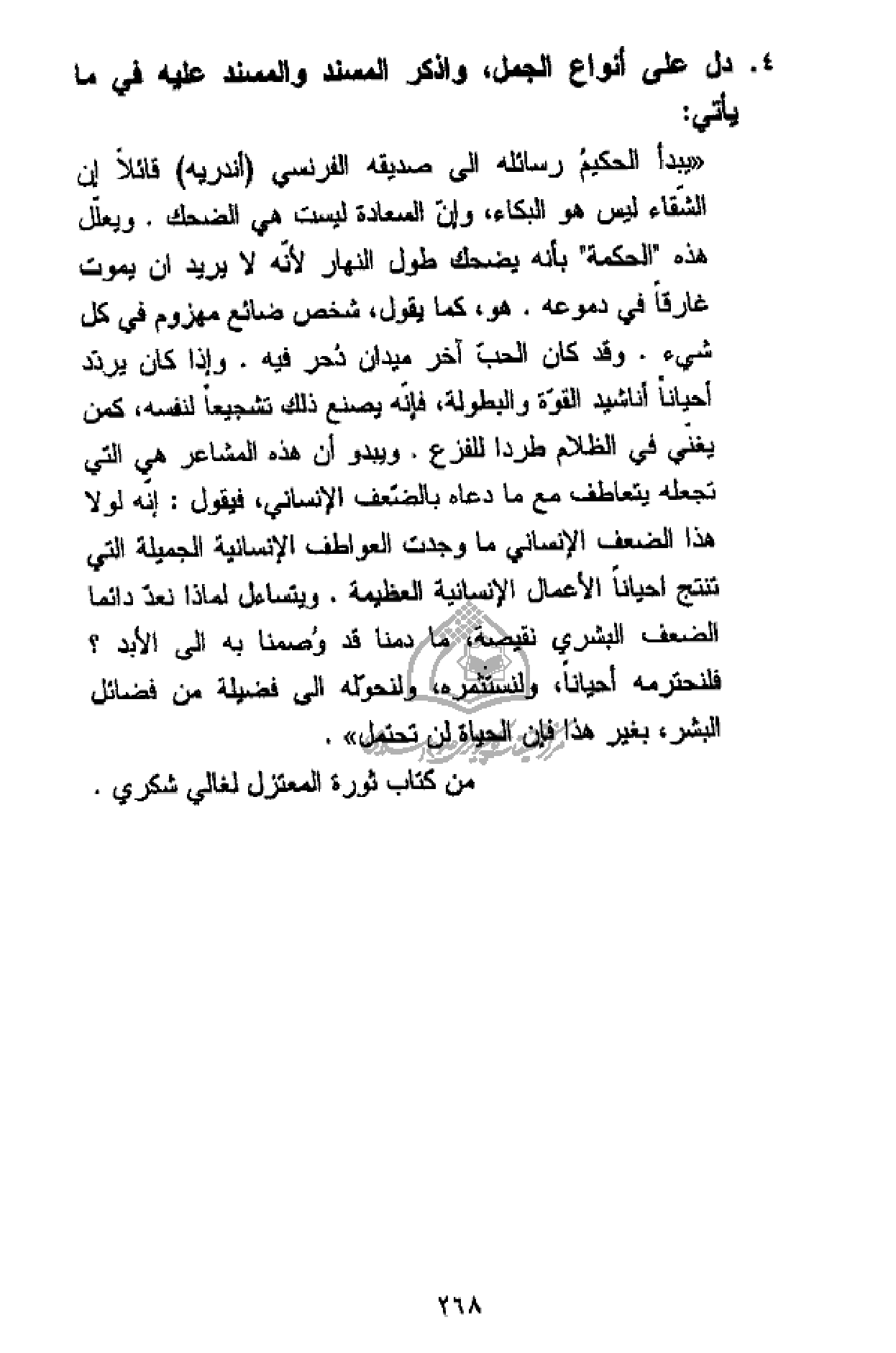 «يبدأ الحكيم رسائله الى صديقه الفرنسي (أندريه) قائلا إن الشّقاء ليس هو البكاء، وإنّ السعادة ليست هي الضحك. ويعلّل هذه «الحكمة» بأنه يضحك طول النهار لأنّه لا يريد ان يموت غارقا في دموعه. هو، كما يقول، شخص ضائع مهزوم في كل شيء. وقد كان الحبّ آخر ميدان دحر فيه. وإذا كان يردّد أحيانا أناشيد القوّة والبطولة، فإنّه يصنع ذلك تشجيعا لنفسه، كمن يغنّي في الظلام طردا للفزع. ويبدو أن هذه المشاعر هي التي تجعله يتعاطف مع ما دعاه بالضّعف الإنساني، فيقول: إنّه لولا هذا الضعف الإنساني ما وجدت العواطف الإنسانية الجميلة التي تنتج احيانا الأعمال الإنسانية العظيمة. ويتساءل لماذا نعدّ دائما الضعف البشري نقيصة، ما دمنا قد وصمنا به الى الأبد؟