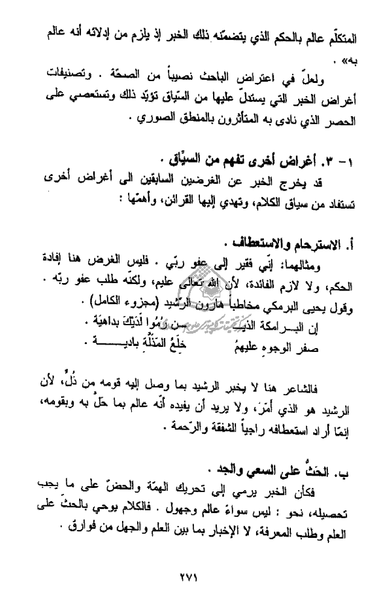 ولعلّ في اعتراض الباحث نصيبا من الصحّة. وتصنيفات أغراض الخبر التي يستدلّ عليها من السّياق تؤيّد ذلك وتستعصي على الحصر الذي نادى به المتأثرون بالمنطق الصوري.