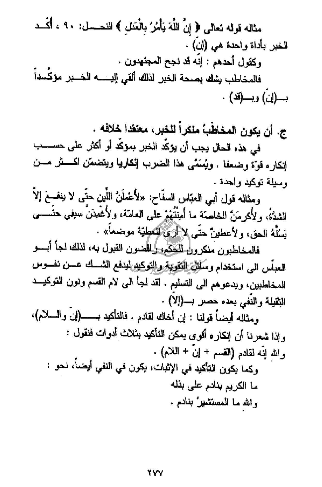 ومثاله أيضا قولنا: إن أخاك لقادم. فالتأكيد ب (إنّ واللام)، وإذا شعرنا أن إنكاره أقوى يمكن التأكيد بثلاث أدوات فنقول: