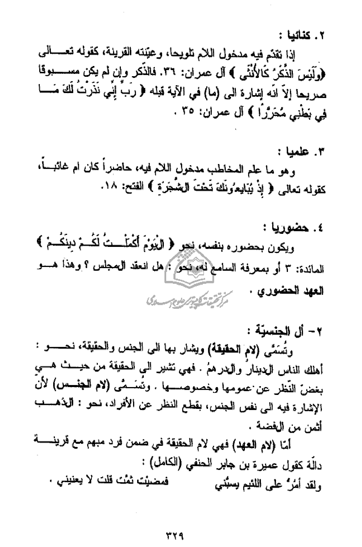 إذا تقدّم فيه مدخول اللام تلويحا، وعيّنته القرينة، كقوله تعالى وَلَيْسَ الذَّكَرُ كَالْأُنْثى آل عمران: 36. فالذّكر وإن لم يكن مسبوقا صريحا إلّا انّه إشارة الى (ما) في الآية قبله رَبِّ إِنِّي نَذَرْتُ لَكَ ما فِي بَطْنِي مُحَرَّراً آل عمران: 35.
