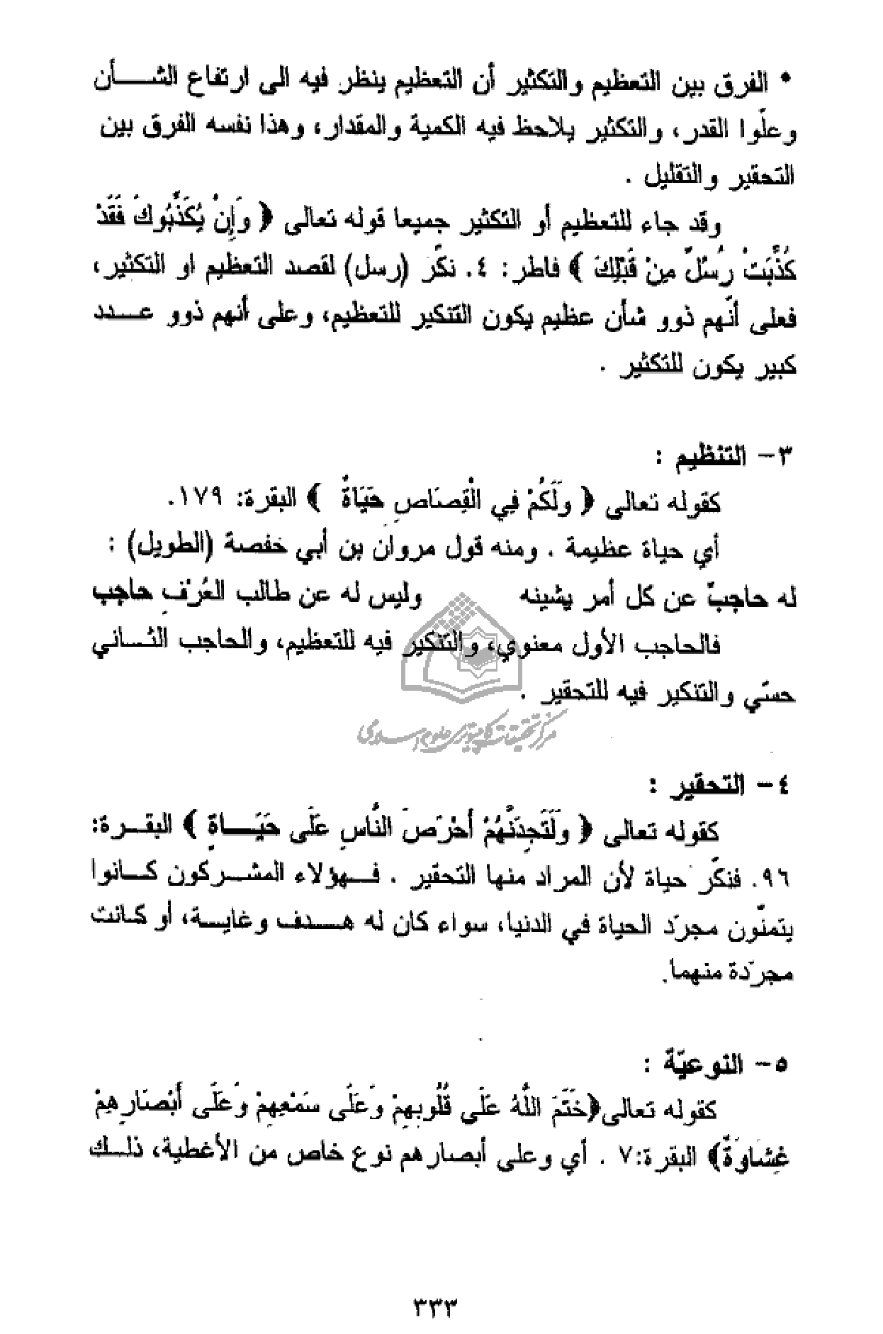 * الفرق بين التعظيم والتكثير أن التعظيم ينظر فيه الى ارتفاع الشأن وعلّوا القدر، والتكثير يلاحظ فيه الكمية والمقدار، وهذا نفسه الفرق بين التحقير والتقليل.