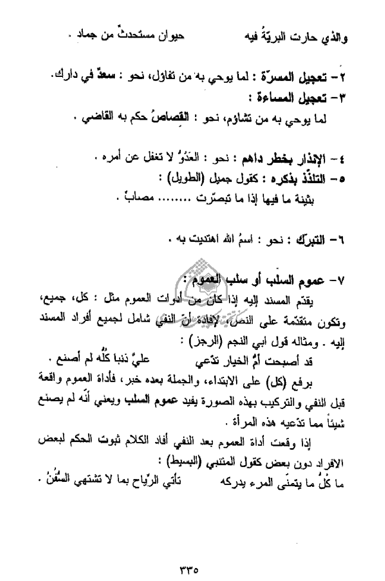 إذا وقعت أداة العموم بعد النفي أفاد الكلام ثبوت الحكم لبعض الافراد دون بعض كقول المتنبي (البسيط):