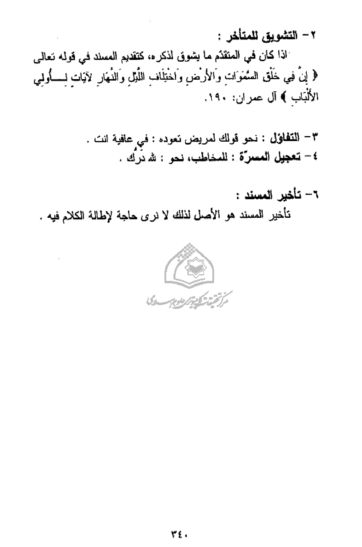 إذا كان في المتقدّم ما يشوق لذكره، كتقديم المسند في قوله تعالى إِنَّ فِي خَلْقِ السَّماواتِ وَالْأَرْضِ وَاخْتِلافِ اللَّيْلِ وَالنَّهارِ لَآياتٍ لِأُولِي الْأَلْبابِ آل عمران: 190.