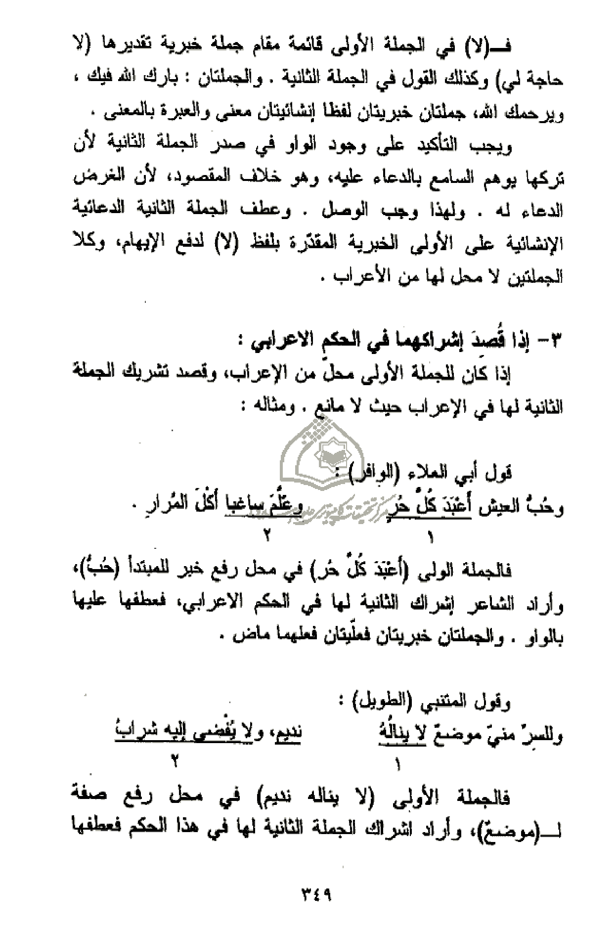 ويجب التأكيد على وجود الواو في صدر الجملة الثانية لأن تركها يوهم السامع بالدعاء عليه، وهو خلاف المقصود، لأن الغرض الدعاء له. ولهذا وجب الوصل. وعطف الجملة الثانية الدعائية الإنشائية على الأولى الخبرية المقدّرة بلفظ (لا) لدفع الإيهام، وكلا الجملتين لا محل لها من الأعراب.
