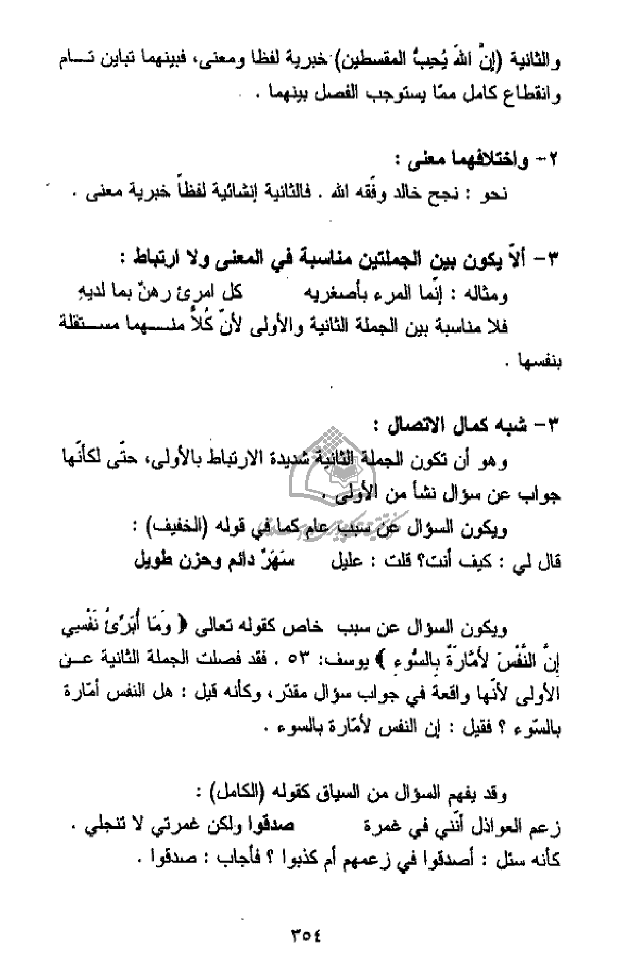 وهو أن تكون الجملة الثانية شديدة الارتباط بالأولى، حتّى لكأنّها جواب عن سؤال نشأ من الأولى.
