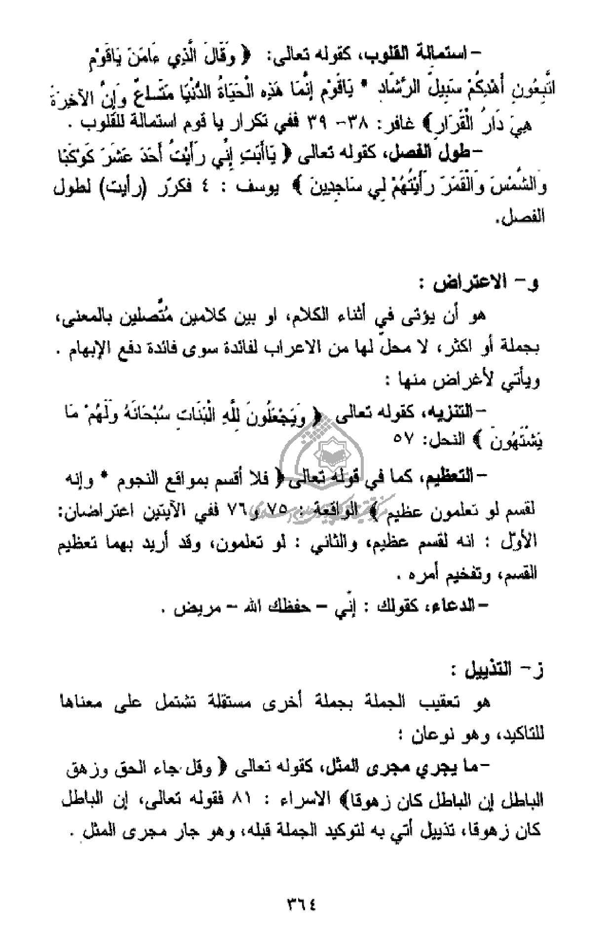 هو أن يؤتى في أثناء الكلام، او بين كلامين متّصلين بالمعنى، بجملة أو اكثر، لا محلّ لها من الاعراب لفائدة سوى فائدة دفع الإبهام.