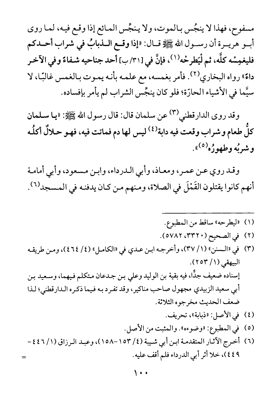 وقد روى الدارقطني (¬٣) عن سلمان قال: قال رسول الله - صلى الله عليه وسلم -: "يا سلمان كلُّ طعام وشراب وقعت فيه دابة (¬٤) ليس لها دم فماتت فيه، فهو حلالٌ أكلُه وشربُه وطهورُه (¬٥) ".
