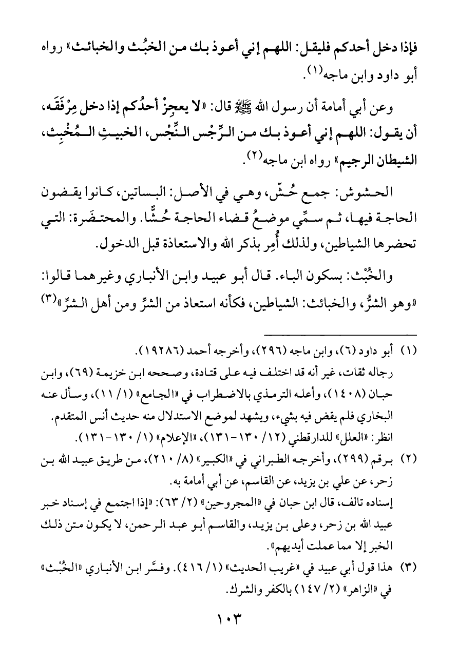 (¬٣) هذا قول أبي عبيد في "غريب الحديث" (١/ ٤١٦). وفسَّر ابن الأنباري "الخُبْث" في "الزاهر" (٢/ ١٤٧) بالكفر والشرك.