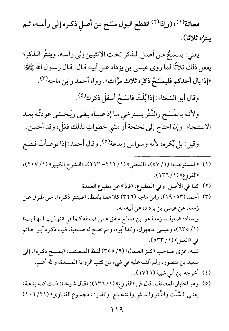 يعني: يمسحُ من أصل الذكر تحت الأنثيين إلى رأسه، وينتُر الذكر؛ يفعل ذلك ثلاثًا لما روى عيسى بن يزداد عن أبيه قال: قال رسول الله - صلى الله عليه وسلم -: "إذا بال أحدكم فليمسَحْ ذكرَه ثلاث مرَّات". رواه أحمد وابن ماجه (¬٣).