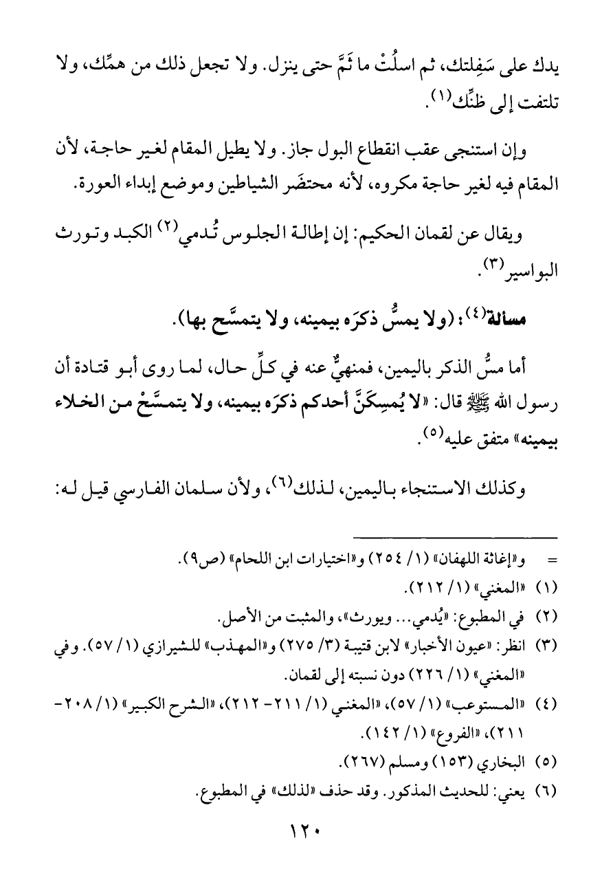 مسألة (¬٤): (ولا يمسُّ ذكرَه بيمينه، ولا يتمسَّح بها).