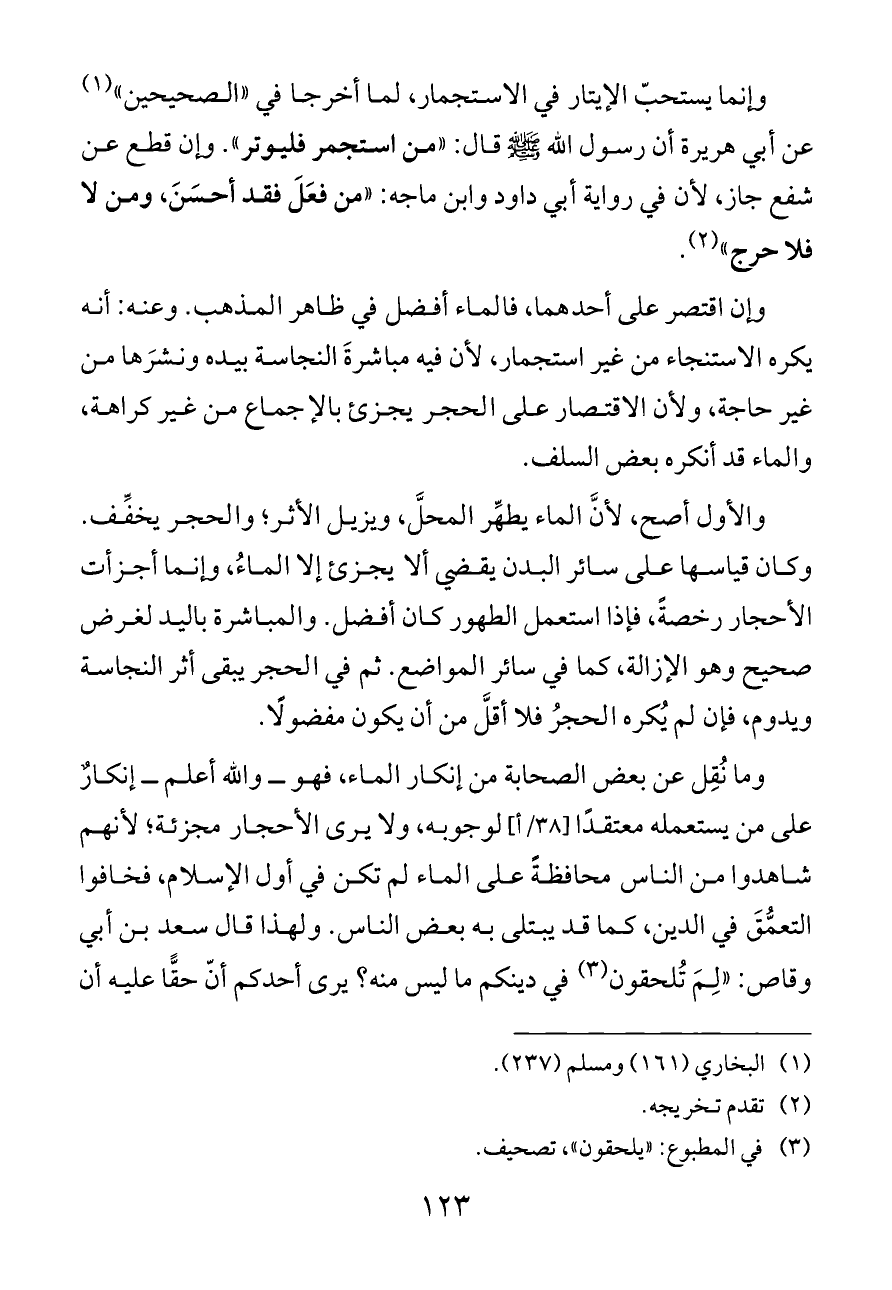وما نُقِل عن بعض الصحابة من إنكار الماء، فهو ــ والله أعلم ــ إنكارٌ على من يستعمله معتقدًا [٣٨/أ] لوجوبه، ولا يرى الأحجار مجزئة؛ لأنهم شاهدوا من الناس محافظةً على الماء لم تكن في أول الإسلام، فخافوا التعمُّقَ في الدين، كما قد يبتلى به بعض الناس. ولهذا قال سعد بن أبي وقاص: "لِمَ تُلحقون (¬٣) في دينكم ما ليس منه؟ يرى أحدكم أنّ حقًّا عليه أن
