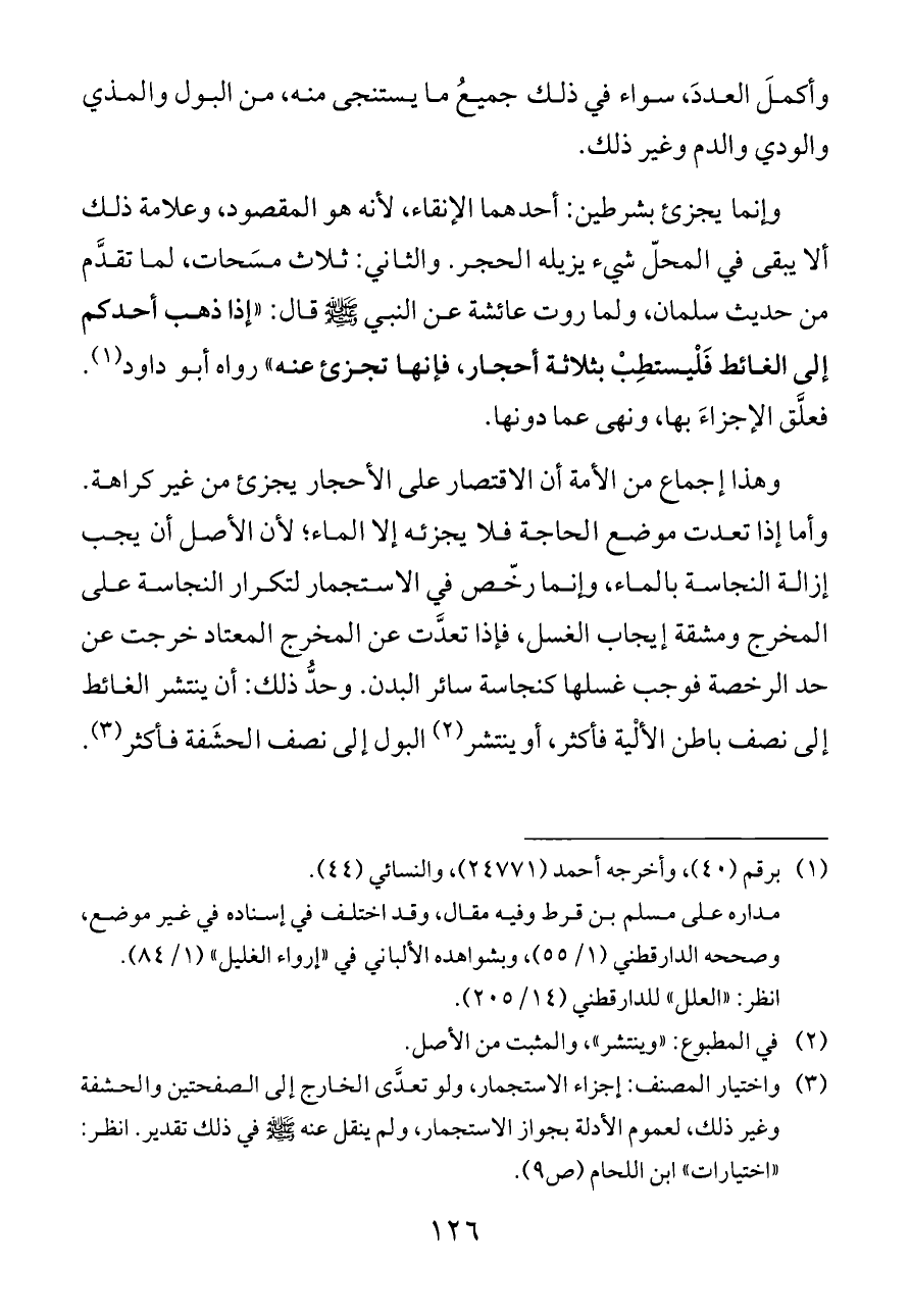وهذا إجماع من الأمة أن الاقتصار على الأحجار يجزئ من غير كراهة. وأما إذا تعدت موضع الحاجة فلا يجزئه إلا الماء؛ لأن الأصل أن يجب إزالة النجاسة بالماء، وإنما رخّص في الاستجمار لتكرار النجاسة على المخرج ومشقة إيجاب الغسل، فإذا تعدَّت عن المخرج المعتاد خرجت عن حد الرخصة فوجب غسلها كنجاسة سائر البدن. وحدُّ ذلك: أن ينتشر الغائط إلى نصف باطن الألْية فأكثر، أو ينتشر (¬٢) البول إلى نصف الحشَفة فأكثر (¬٣)