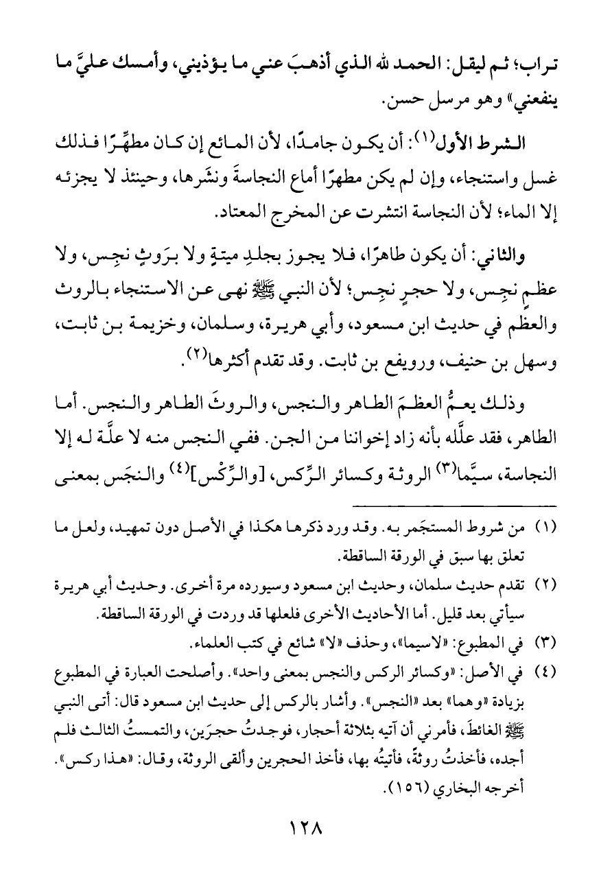 والثاني: أن يكون طاهرًا، فلا يجوز بجلدِ ميتةٍ ولا برَوثٍ نجِس، ولا عظمٍ نجِس، ولا حجرٍ نجِس؛ لأن النبي - صلى الله عليه وسلم - نهى عن الاستنجاء بالروث والعظم في حديث ابن مسعود، وأبي هريرة، وسلمان, وخزيمة بن ثابت، وسهل بن حنيف، ورويفع بن ثابت. وقد تقدم أكثرها (¬٢).