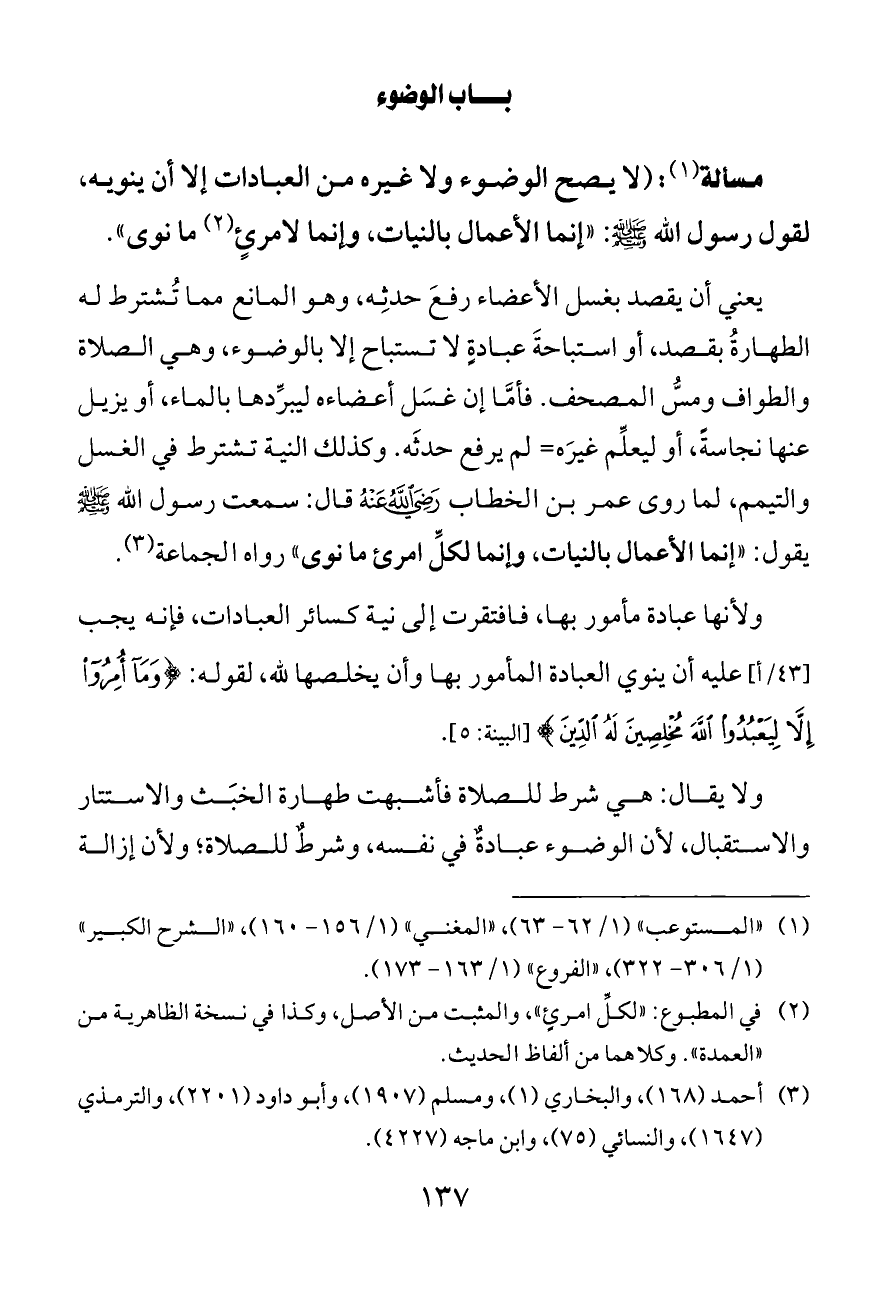 يعني أن يقصد بغسل الأعضاء رفعَ حدثِه، وهو المانع مما تُشترط له الطهارةُ بقصد، أو استباحةَ عبادةٍ لا تستباح إلا بالوضوء، وهي الصلاة والطواف ومسُّ المصحف. فأمَّا إن غسَل أعضاءه ليبرِّدها بالماء، أو يزيل عنها نجاسةً، أو ليعلِّم غيرَه= لم يرفع حدثَه. وكذلك النية تشترط في الغسل والتيمم، لما روى عمر بن الخطاب - رضي الله عنه - قال: سمعت رسول الله - صلى الله عليه وسلم - يقول: "إنما الأعمال بالنيات، وإنما لكلِّ امرئ ما نوى" رواه الجماعة (¬٣).
