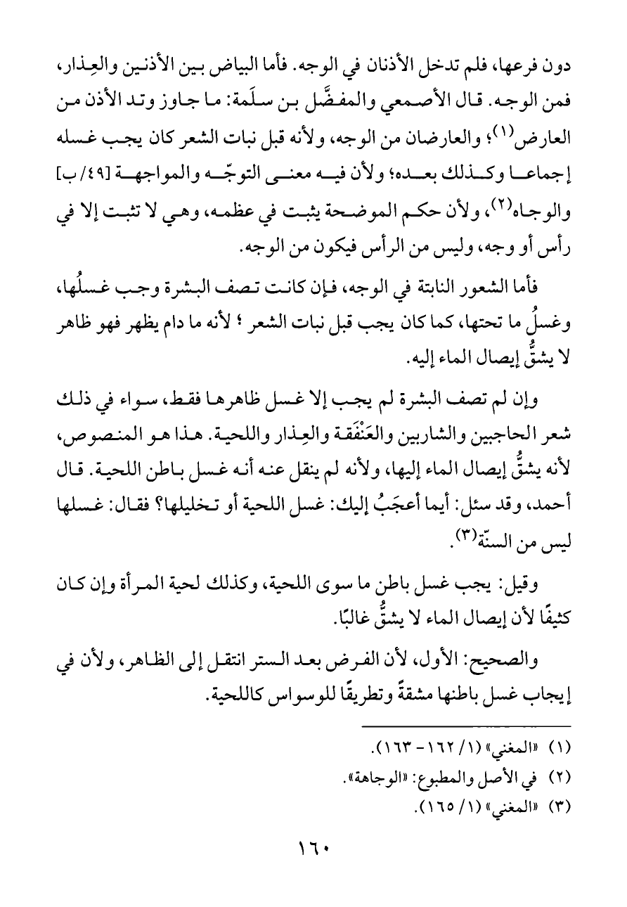 دون فرعها، فلم تدخل الأذنان في الوجه. فأما البياض بين الأذنين والعِذار، فمن الوجه. قال الأصمعي والمفضَّل بن سلَمة: ما جاوز وتد الأذن من العارض (¬١)؛ والعارضان من الوجه، ولأنه قبل نبات الشعر كان يجب غسله إجماعا وكذلك بعده؛ ولأن فيه معنى التوجّه والمواجهة [٤٩/ب] والوجاه (¬٢)، ولأن حكم الموضحة يثبت في عظمه، وهي لا تثبت إلا في رأس أو وجه، وليس من الرأس فيكون من الوجه.