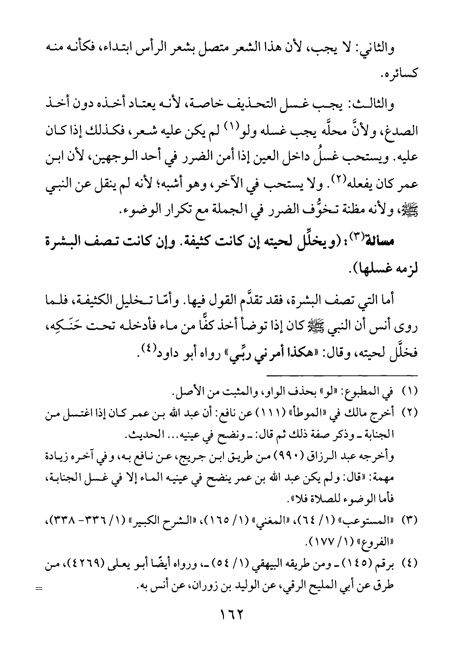 أما التي تصف البشرة، فقد تقدَّم القول فيها. وأمّا تخليل الكثيفة، فلما روى أنس أن النبي - صلى الله عليه وسلم - كان إذا توضأ أخذ كفًّا من ماء فأدخله تحت حَنَكِه، فخلَّل لحيته، وقال: "هكذا أمرني ربِّي" رواه أبو داود (¬٤).