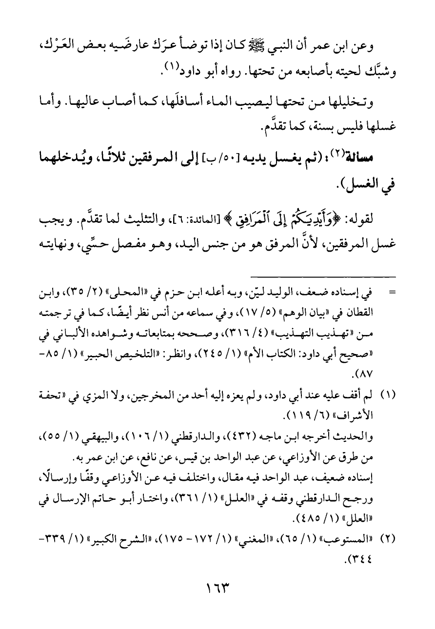 وعن ابن عمر أن النبي - صلى الله عليه وسلم - كان إذا توضأ عرَك عارضَيه بعض العَرْك، وشبَّك لحيته بأصابعه من تحتها. رواه أبو داود (¬١).