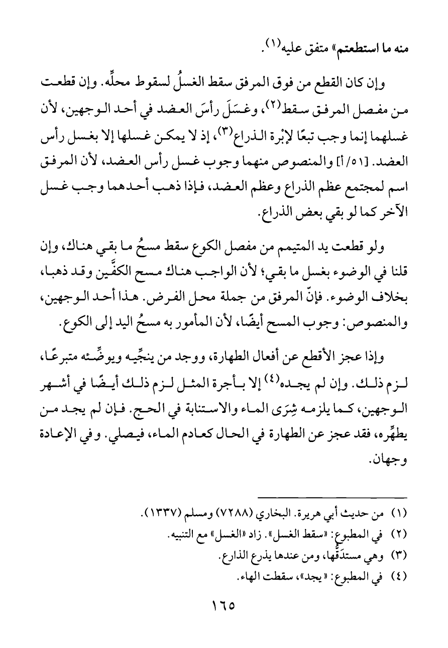وإن كان القطع من فوق المرفق سقط الغسلُ لسقوط محلِّه. وإن قطعت من مفصل المرفق سقط (¬٢)، وغسَلَ رأسَ العضد في أحد الوجهين، لأن غسلهما إنما وجب تبعًا لإبْرة الذراع (¬٣)، إذ لا يمكن غسلها إلا بغسل رأس العضد. [٥١/أ] والمنصوص منهما وجوب غسل رأس العضد، لأن المرفق اسم لمجتمع عظم الذراع وعظم العضد، فإذا ذهب أحدهما وجب غسل الآخر كما لو بقي بعض الذراع.